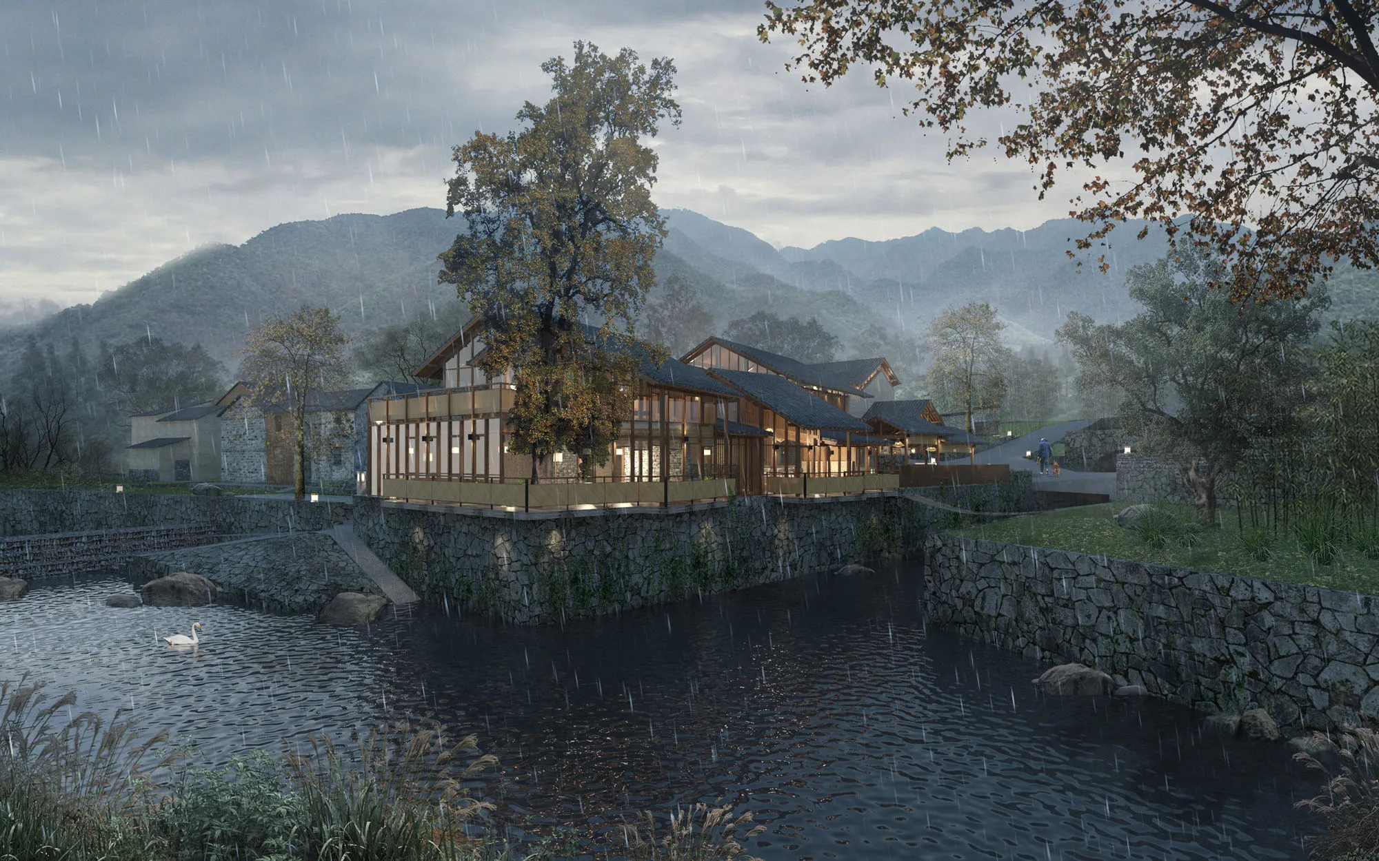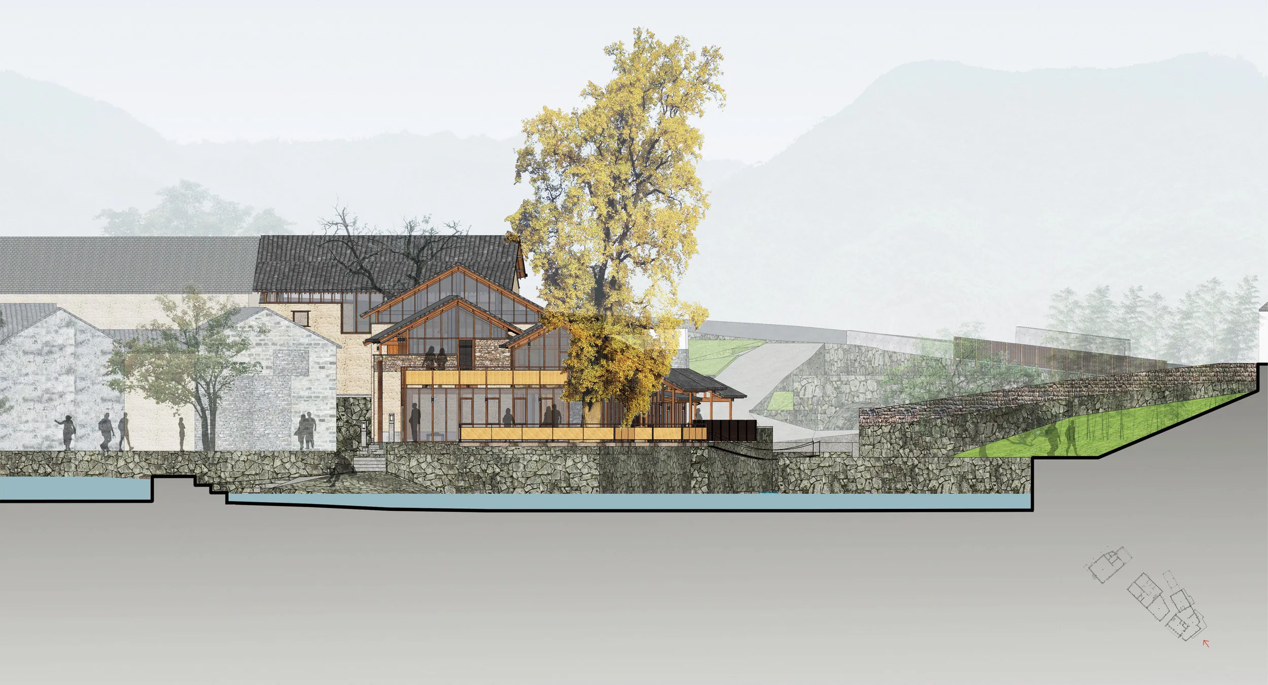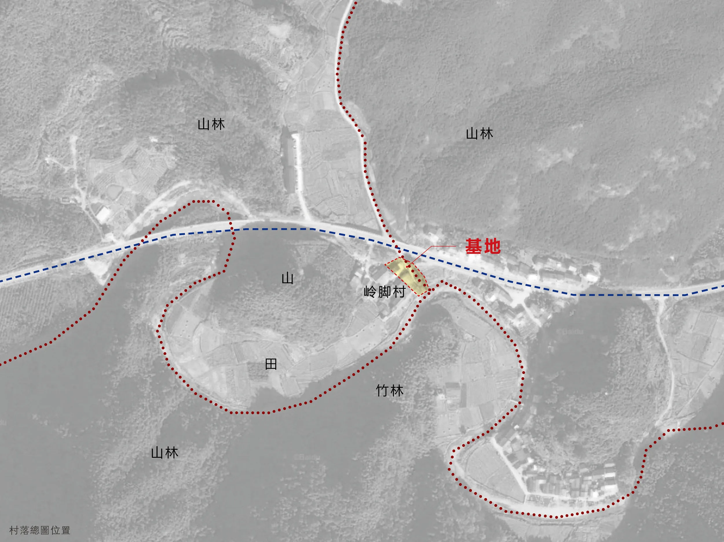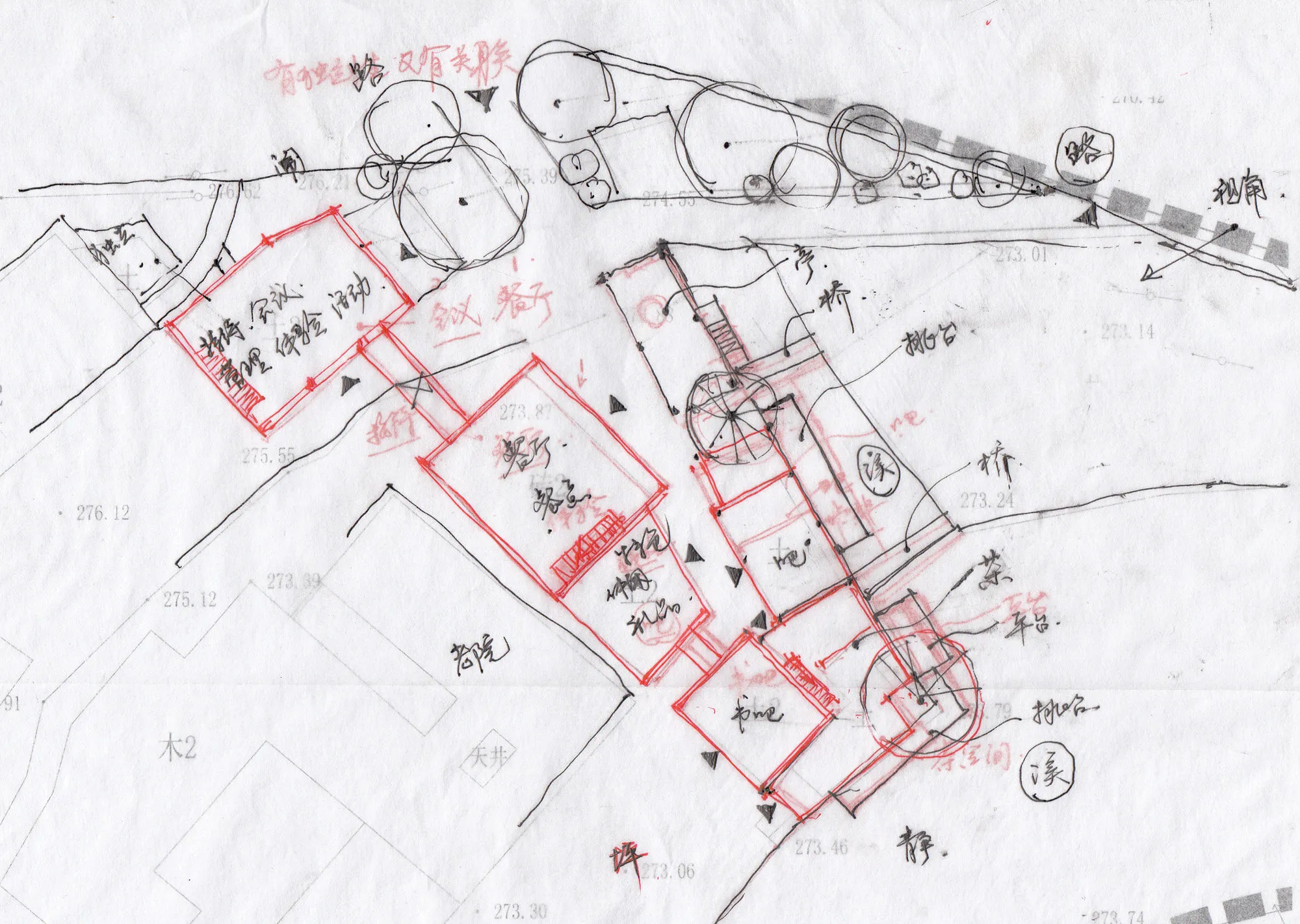第一次上去是10月,在山里开着车顺着国道慢慢行驶,不经意间便到达了村口。溪水潺潺,沿溪行,芳草鲜美,菜地莹莹。走着走着便走到了溪水交汇处,也就是场地的东南角,倒也不是很难找。一棵大树静静地伫立在这里,守护着这个村庄,守护着这片土地。三面有山,空余的地块零星种了些菜,普普通通,不起眼,但这种不起眼却让人相处起来很放松。建筑群背靠着山,前面有两条溪水流过此处,溪水汇集于场地的东北角。一侧紧靠两条溪的交汇处,,一侧靠车行省道,房子之间还有一条公共的道路经过。