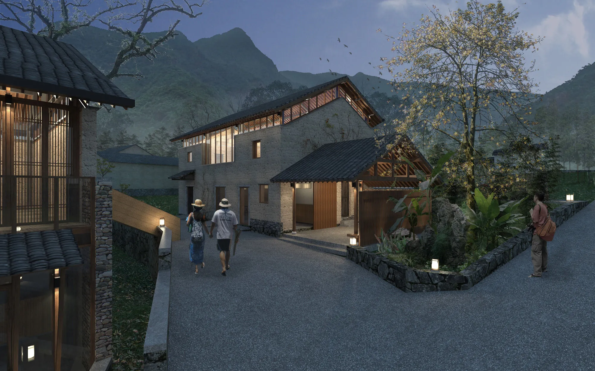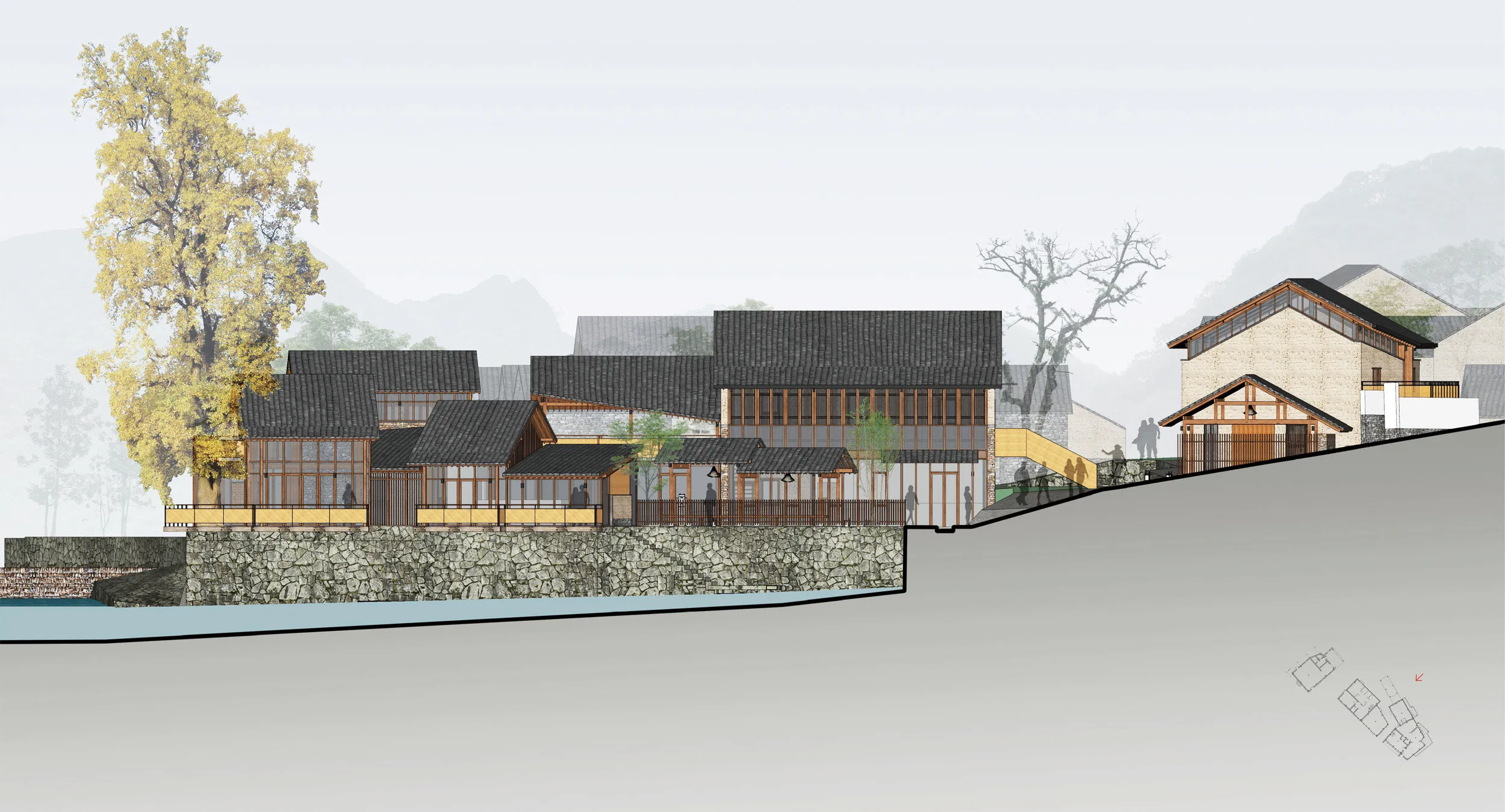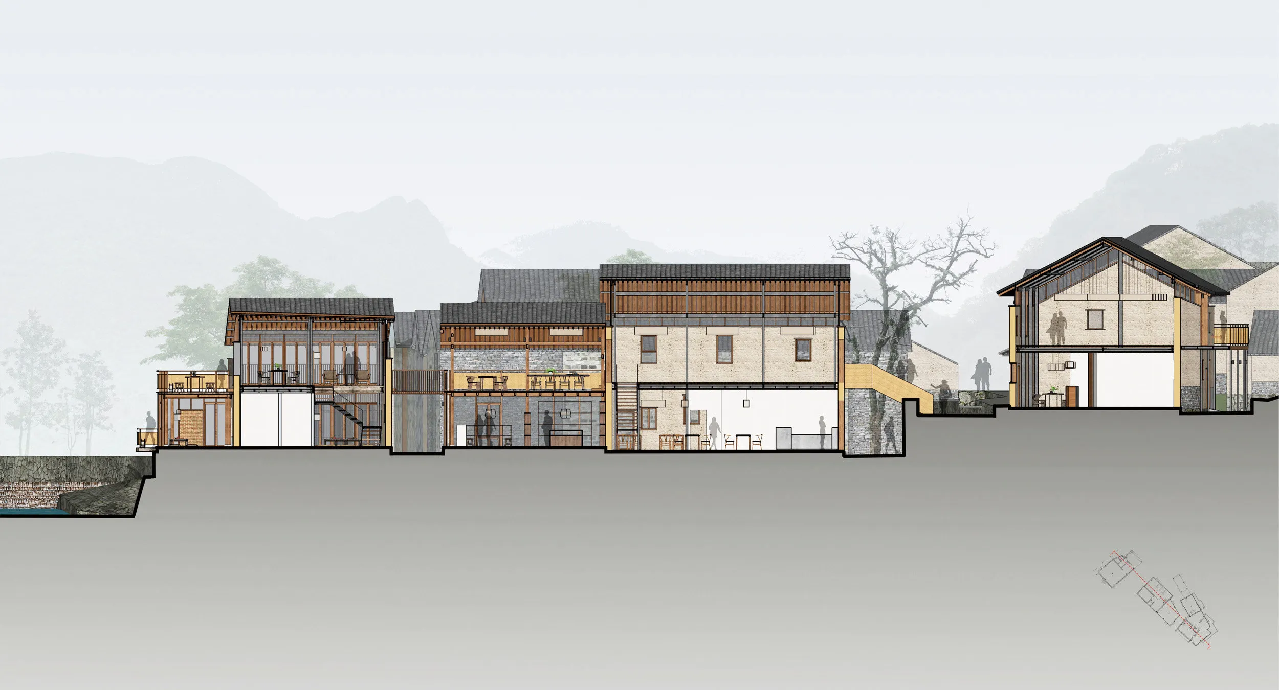 主要建筑的墙体部分保留完整,部分质量较差,将要倒塌,外墙大部分以夯土墙体为主,部分砖墙,石头墙和木头墙。沿水的建筑以小体量坡屋顶的辅助功能建筑为主。太极观念是迷离恍惚地看待万事万物的现象和本质的人生态度,其终极目的是希望人顺应大道至德和自然规律,不为外物所拘,无为而无不为,最终到达一种无所不容的宁静的精神领域。便是希望客人到了这里就能够远离城市,安静的坐在亭榭边喝茶观水,在幽静的山里找到一种自然的生活状态。