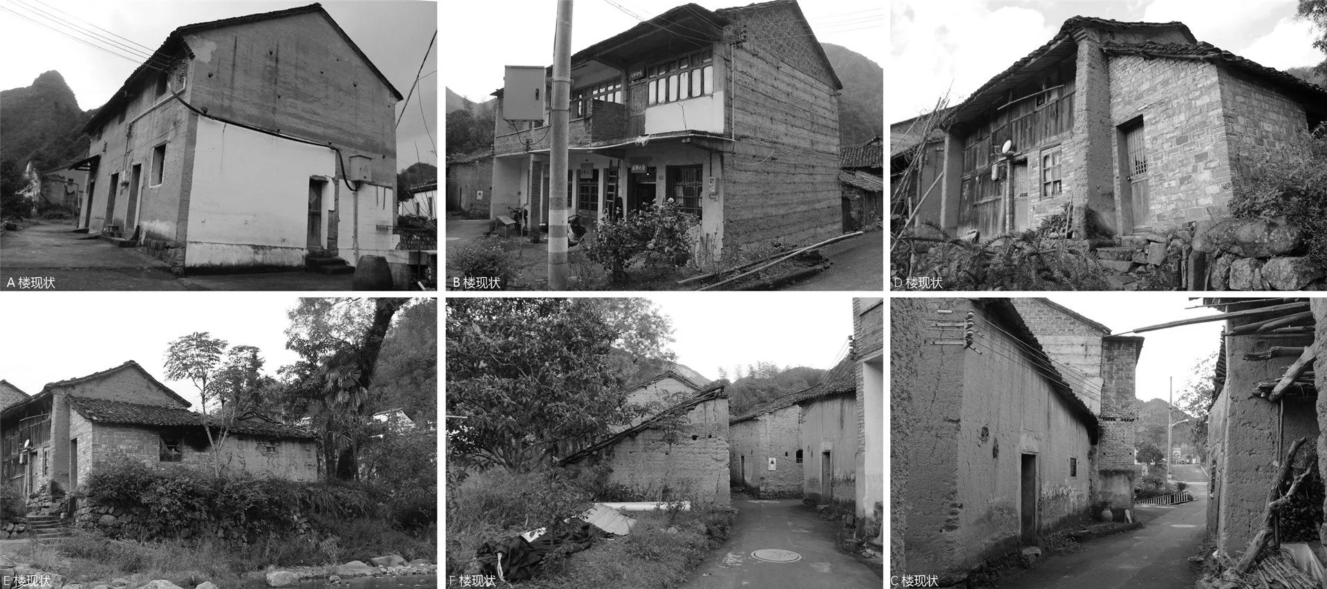 公区建筑群一侧紧靠两条溪的交汇处,一侧靠国道,房子之间还有一条公共的道路经过,房子的墙体部分保留完整,部分质量不佳,将要倒塌,外墙大部分以夯土墙体为主,部分砖墙,石头墙和木头墙。