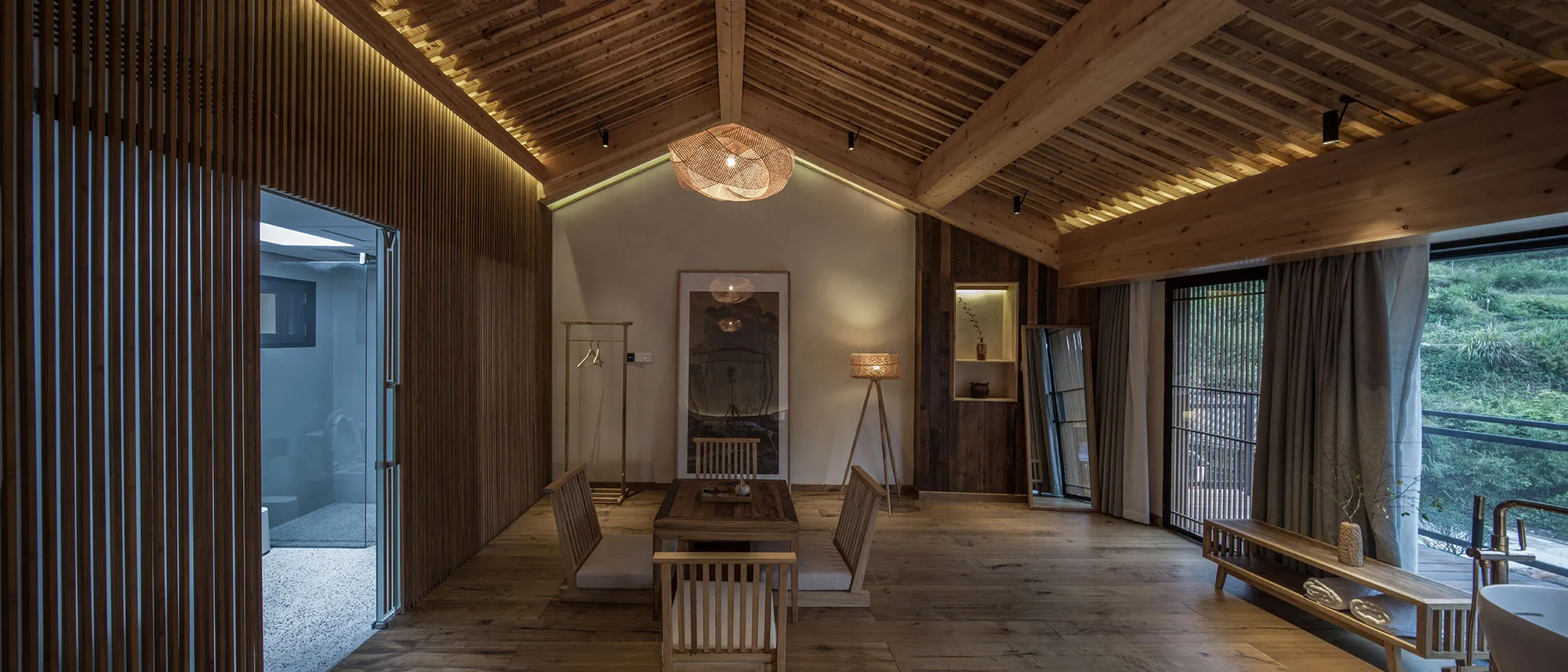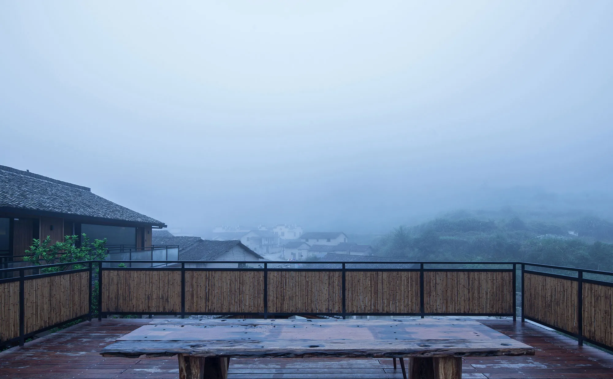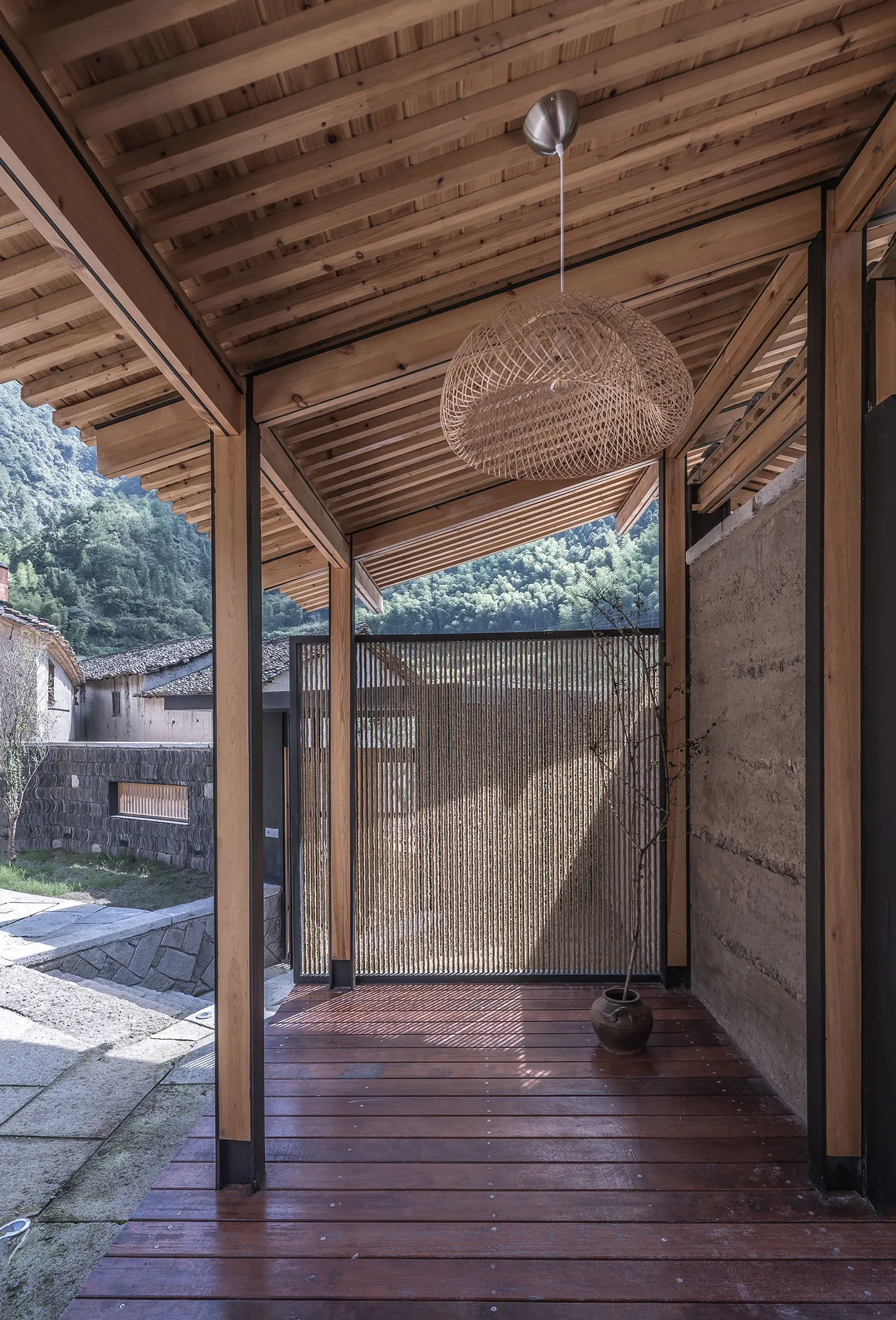站在场地中,映入眼帘的便是溪对岸的梯田古树和环山,将自然景观引入建筑空间中变成一个重要元素,民宿所有的客房大开窗面都面对梯田和山景,最大限度的把山景映入室内空间。望山亭是专门为了看山而设置的喝茶休闲空间,穿插在内庭院和小溪之间,故意将屋檐口压的很低,站在内院视线是被屋檐高度控制往下看梯田和小溪,当你静坐在亭下便环山入目。