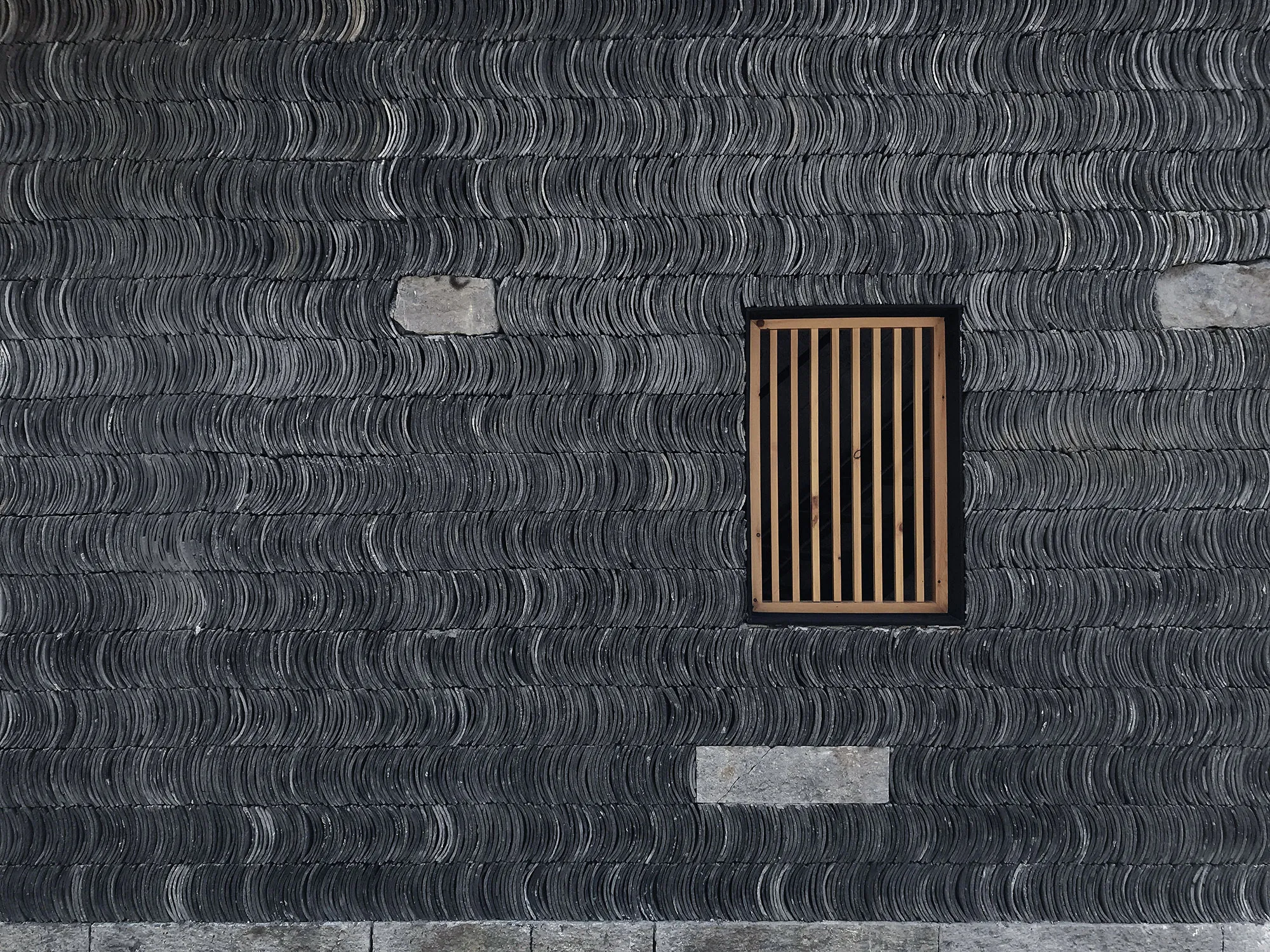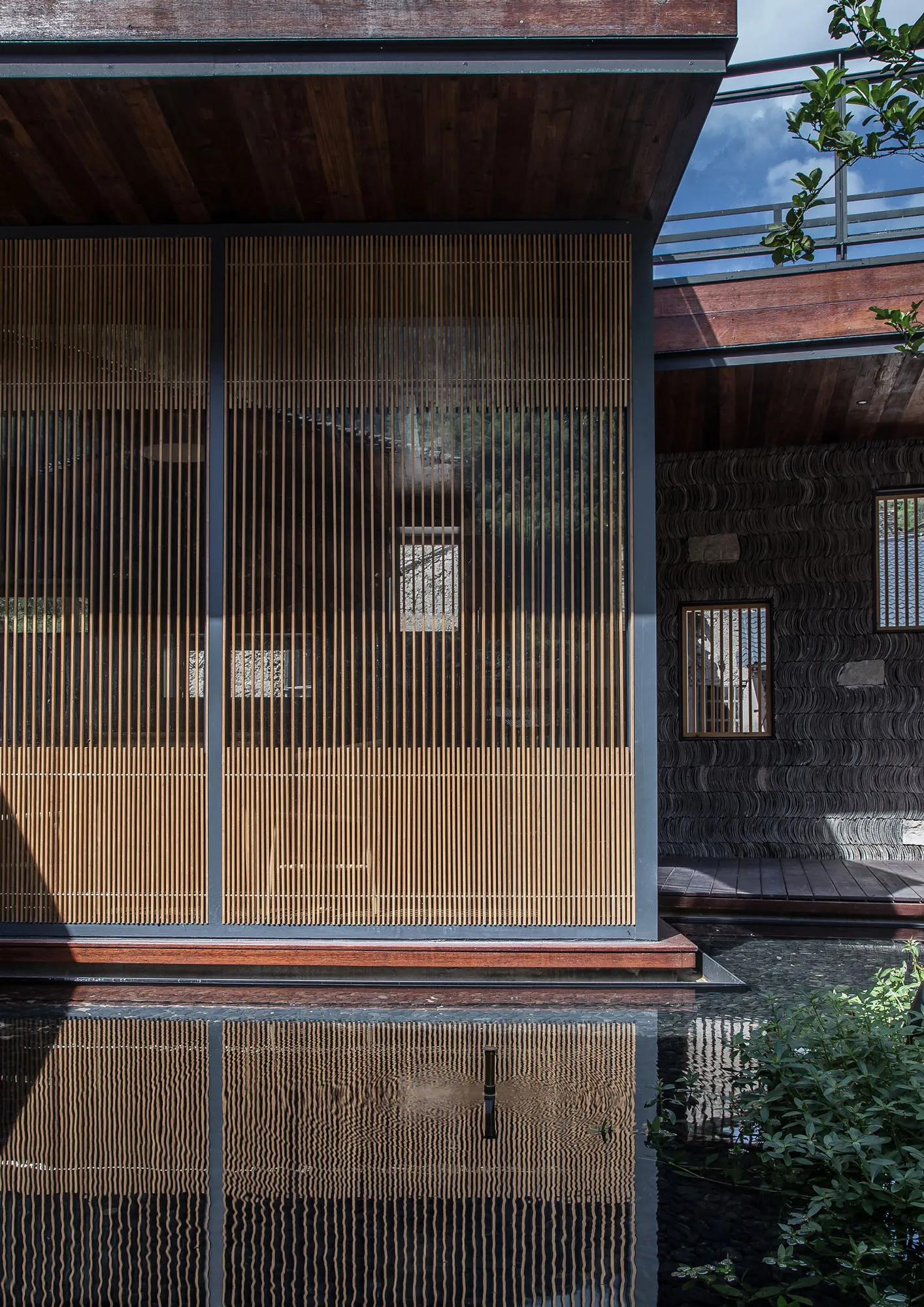 水吧作为民宿里面的公共空间,可以对外开放,是一个比较扁平的空间,外立面用竹格栅疏密布置,分上中下三段,水吧三个界面的视线明暗形成横向连续的画面关系,类似一张古画卷轴,古树在横向的卷轴中变成了画的一部分,卷轴连续的展现了村落巷道、连廊、水院、梯田、古树这些场景,希望用这种视角将人工和自然关连起来。水吧上面的屋顶平台集合了听水看溪、望山、观屋、赏树的所有视角,上楼梯步入平台,视线豁然开朗,建筑与村落环境的关系一下子被放开。