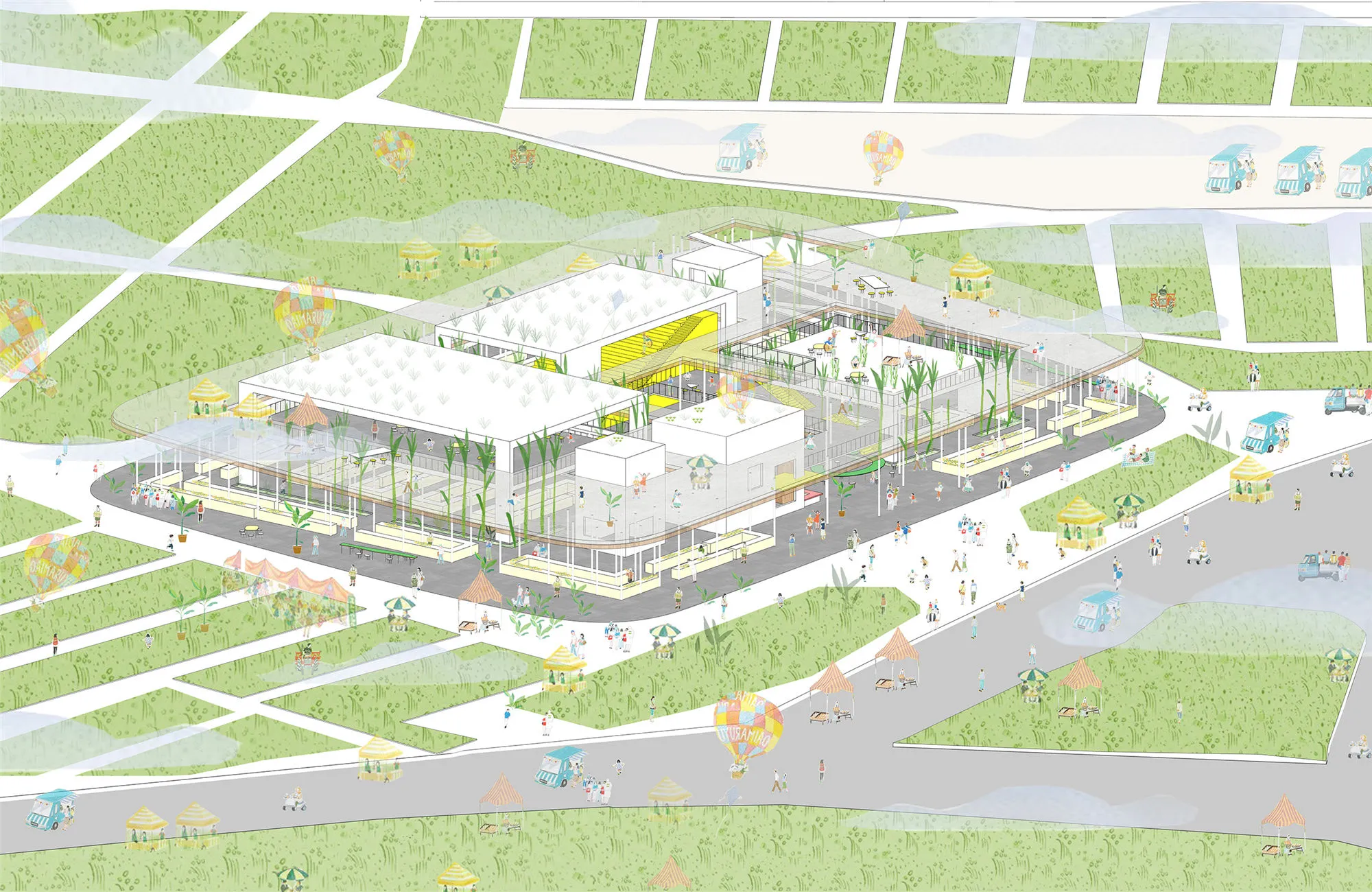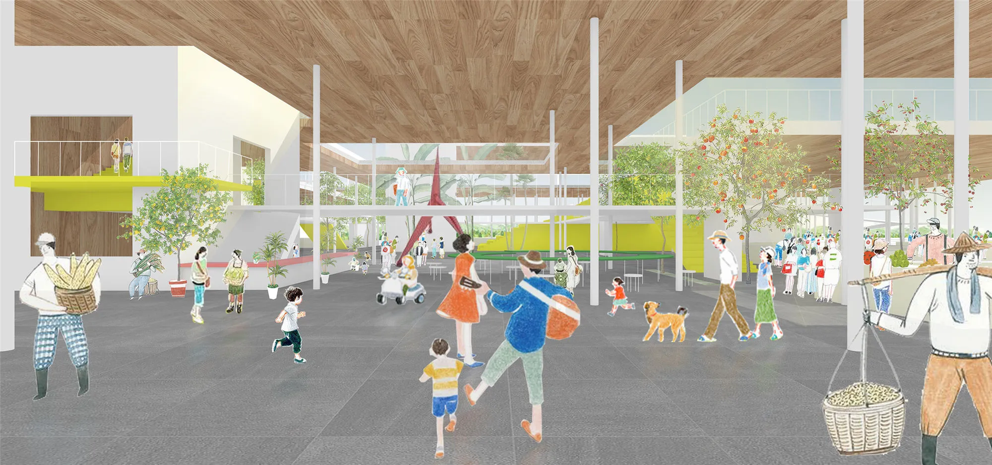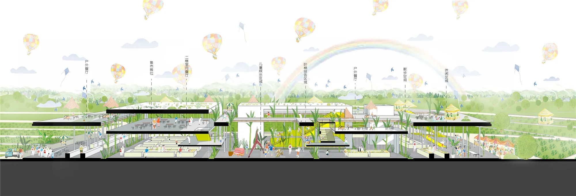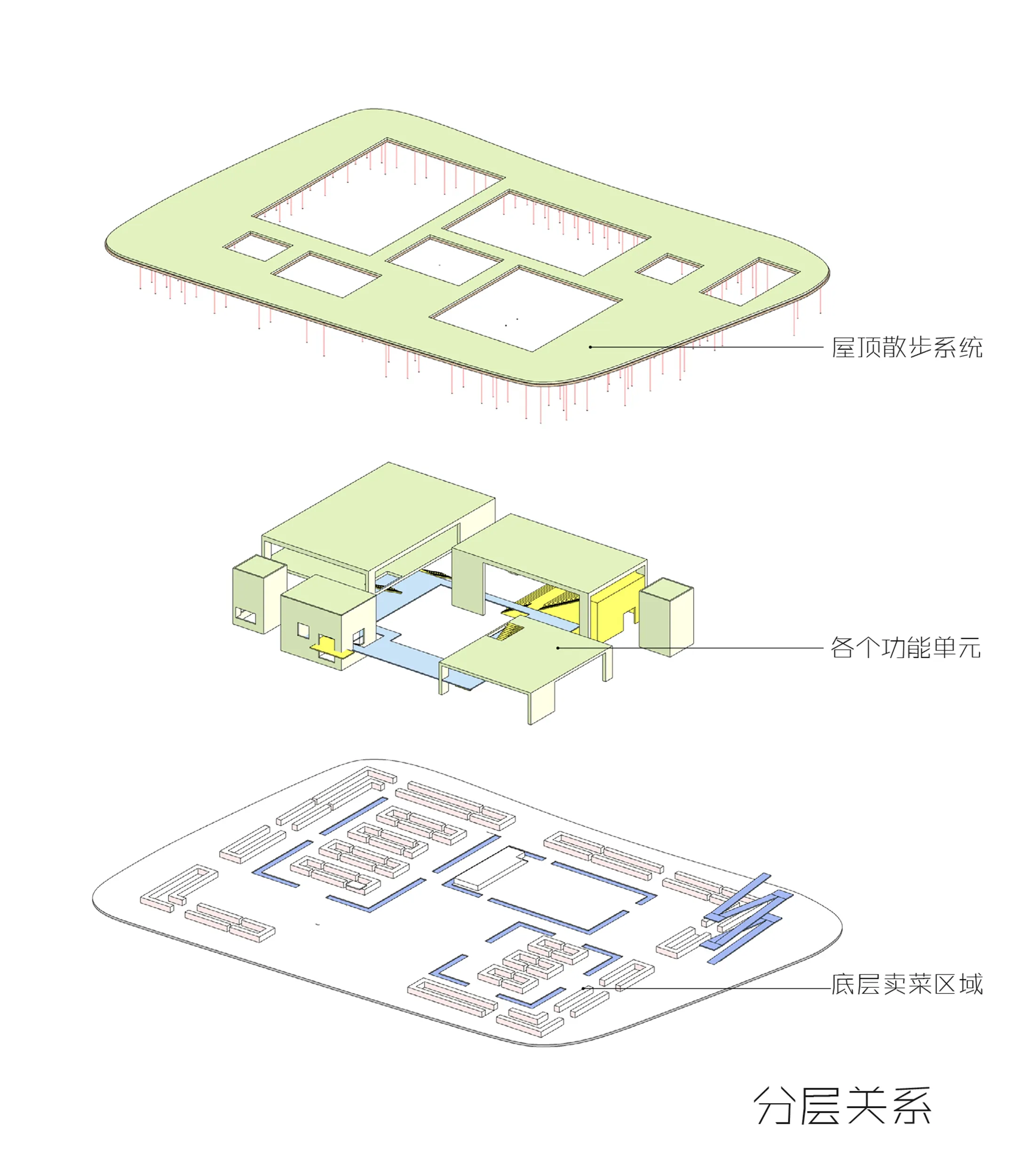 设计的概念源于想让菜场建筑以一种特别开放的姿态面对大众,菜场其本身拥有人们日常生活所必需的使用的功能属性,从来都是不失活力和人群的建筑。但是菜场建筑往往只具有单一的功能属性和单一的使用时间,因此我们希望让建筑能拥有更丰富的功能空间和体验空间来服务当地人以及外来游客,抛弃以往菜场单一的功能和使用时间,采用灵活的开放的大空间,从而达到使用上的多种可能性,诸如中庭空间,可满足多种使用要求,举办当地特色的唱戏活动或各种中小型聚会,宴会或成为当地人休闲娱乐的场所,夹层的多功能阶梯空间,可为当地提供午夜电影剧场活动,举行艺术讨论集会等,屋顶空间一部分成为露台餐厅,成为当地人与外地人交流与休闲的场所,一部分为漫步系统,提供给周边社区散步休闲。建筑外围形成的卖菜区域,菜场融于其中,而不止于此,以一种模糊的定义与渗透的空间边界,从而达到更多的可能性,在空间中融入乡村与城市的多种未知性。采取了完全融入环境的构想,各个空间相互联系又各自分离,保持视觉连续性、空间连续性以及使用的多种可能性。