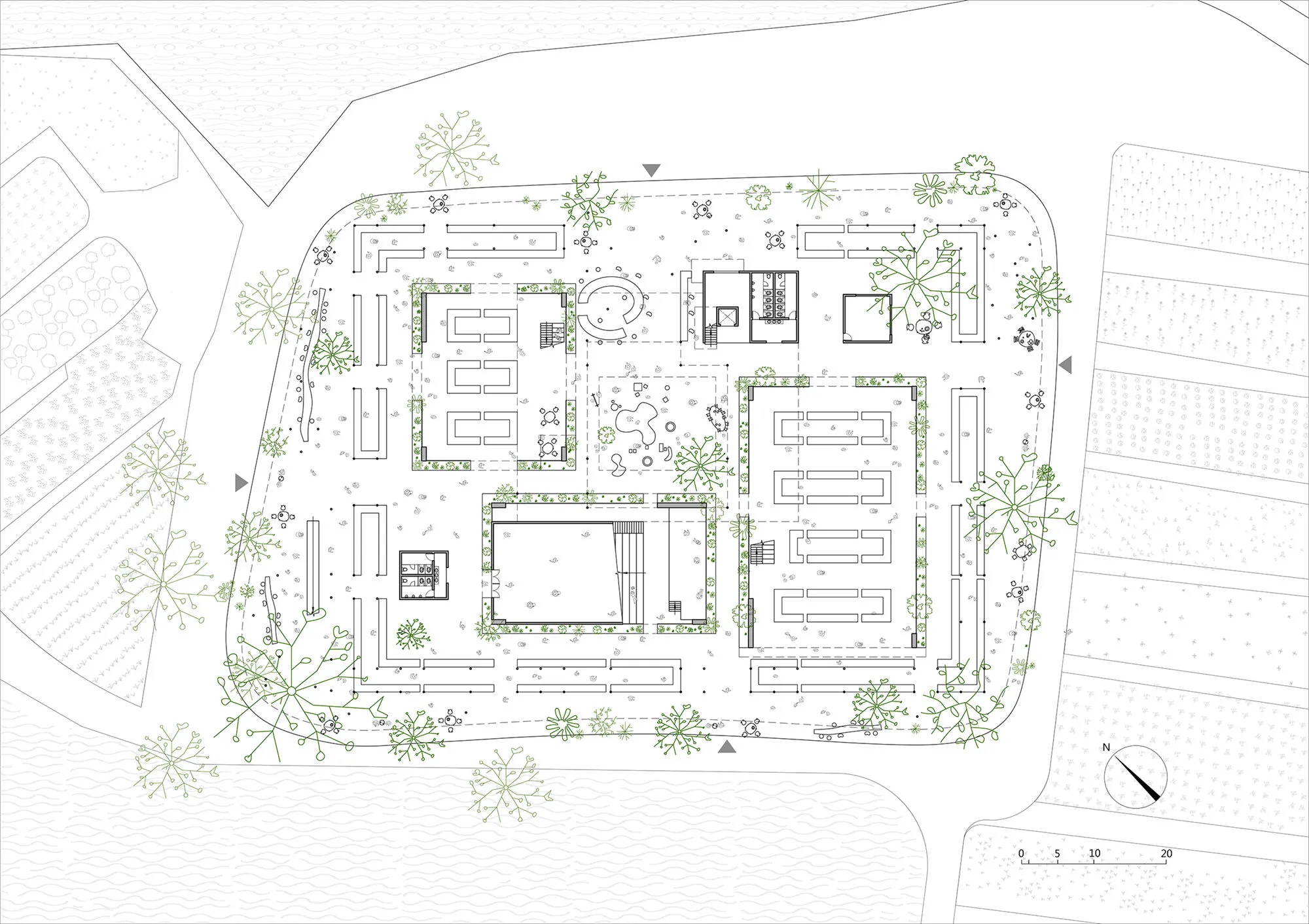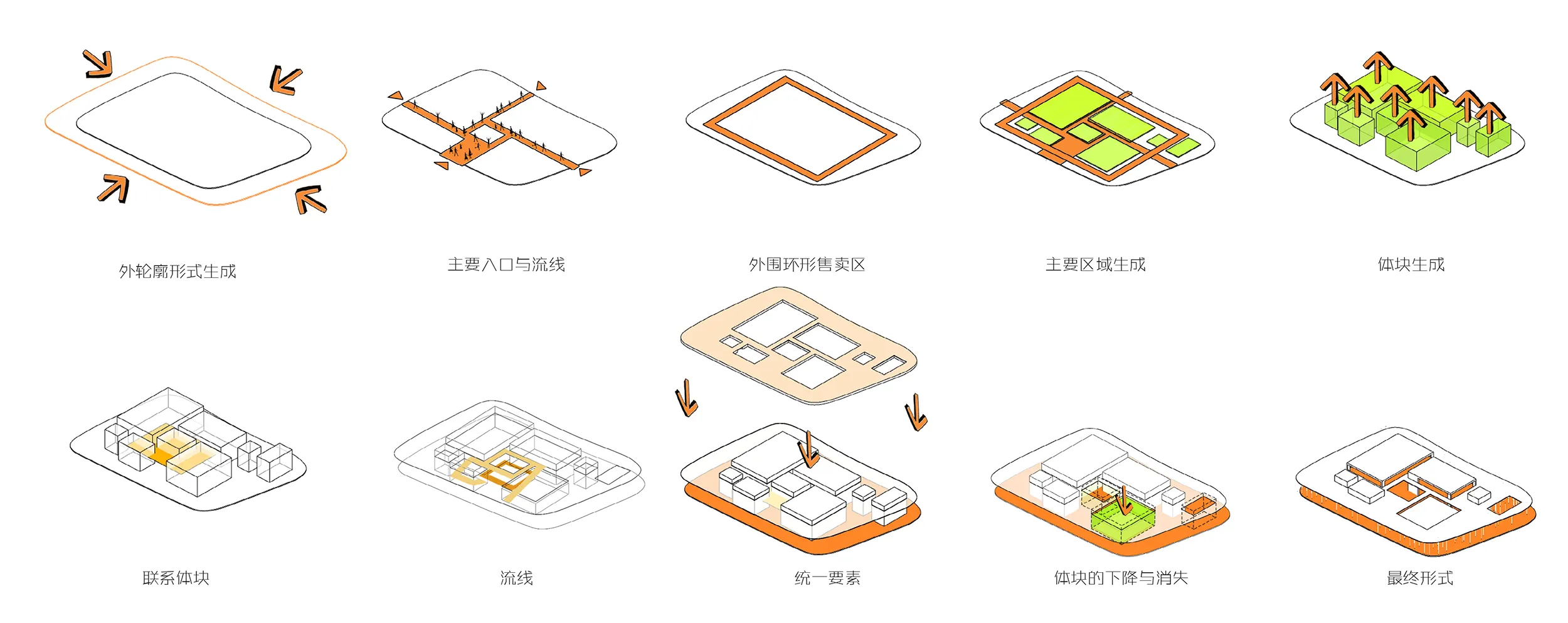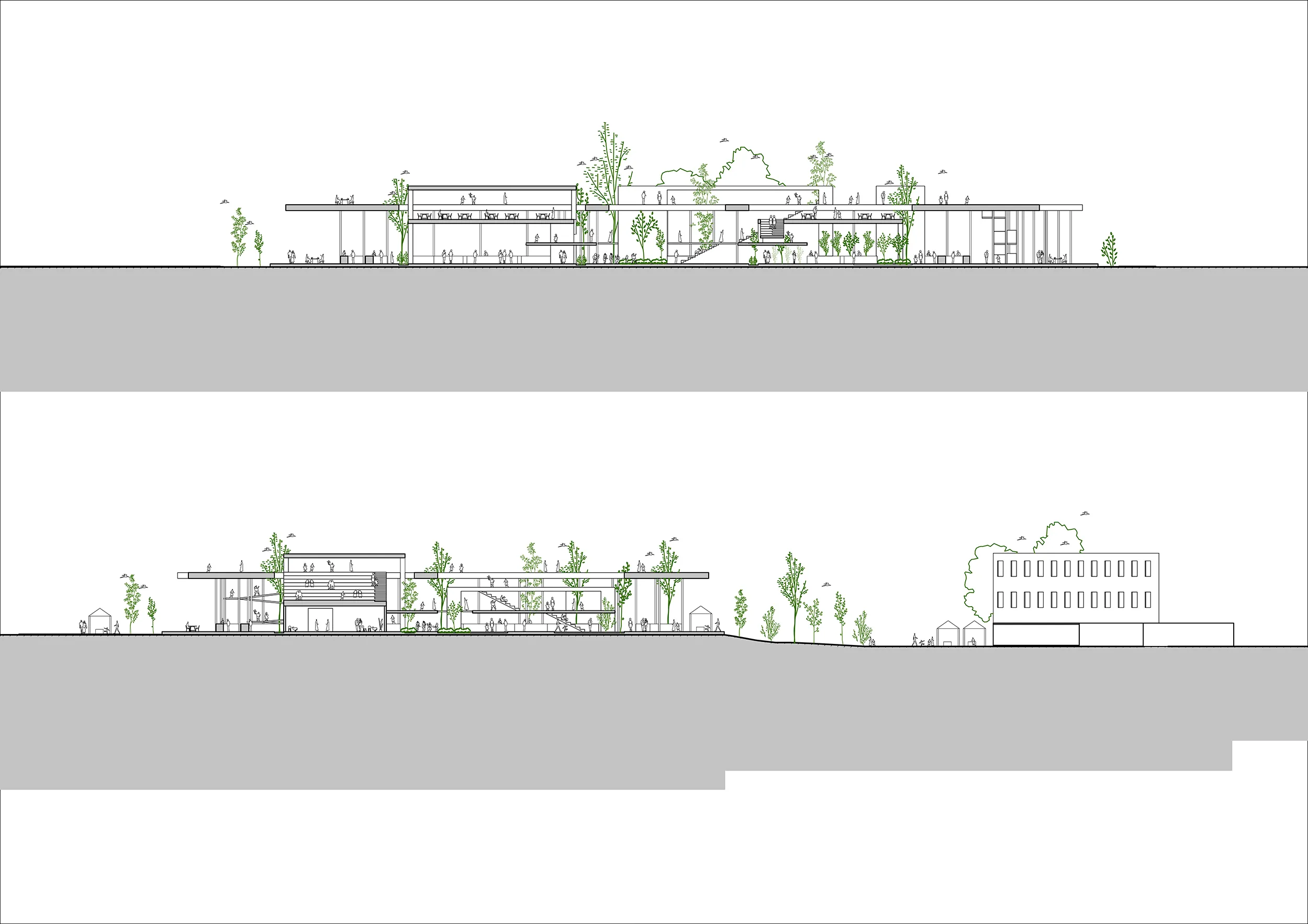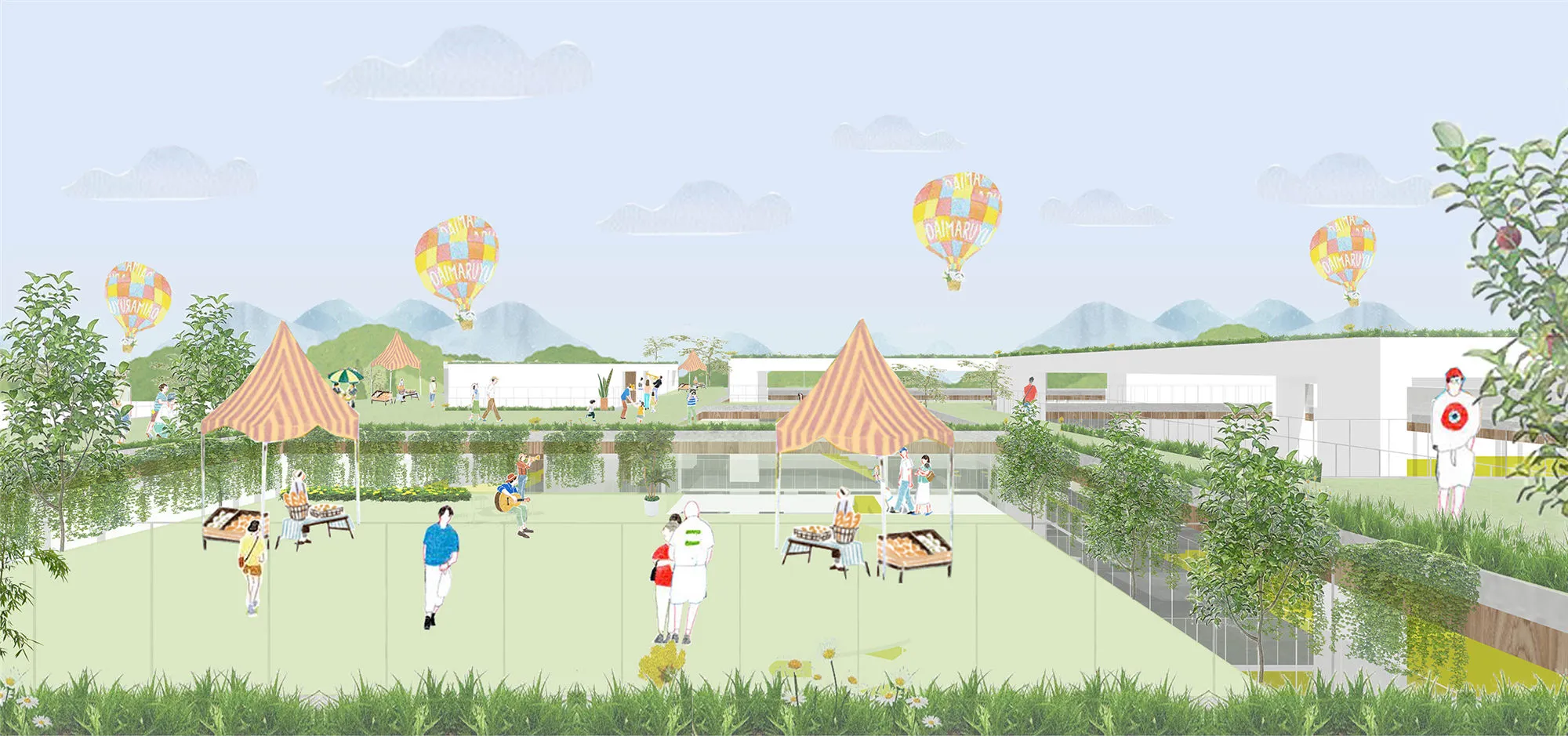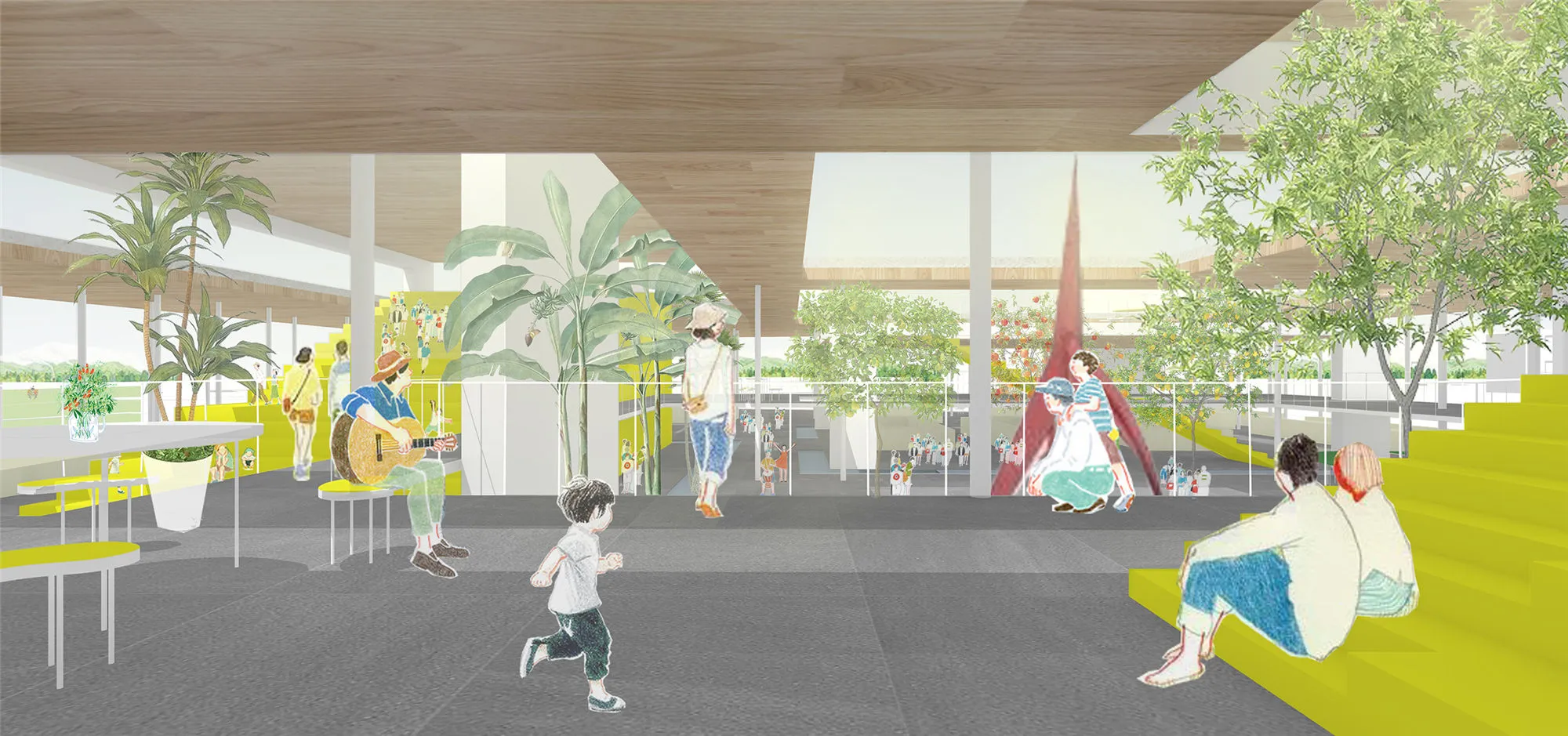 设计的概念源于想让菜场建筑以一种特别开放的姿态面对大众,菜场其本身拥有人们日常生活所必需的使用的功能属性,从来都是不失活力和人群的建筑。但是菜场建筑往往只具有单一的功能属性和单一的使用时间,因此我们希望让建筑能拥有更丰富的功能空间和体验空间来服务当地人以及外来游客,抛弃以往菜场单一的功能和使用时间,采用灵活的开放的大空间,从而达到使用上的多种可能性,诸如中庭空间,可满足多种使用要求,举办当地特色的唱戏活动或各种中小型聚会,宴会或成为当地人休闲娱乐的场所,夹层的多功能阶梯空间,可为当地提供午夜电影剧场活动,举行艺术讨论集会等,屋顶空间一部分成为露台餐厅,成为当地人与外地人交流与休闲的场所,一部分为漫步系统,提供给周边社区散步休闲。建筑外围形成的卖菜区域,菜场融于其中,而不止于此,以一种模糊的定义与渗透的空间边界,从而达到更多的可能性,在空间中融入乡村与城市的多种未知性。采取了完全融入环境的构想,各个空间相互联系又各自分离,保持视觉连续性、空间连续性以及使用的多种可能性。