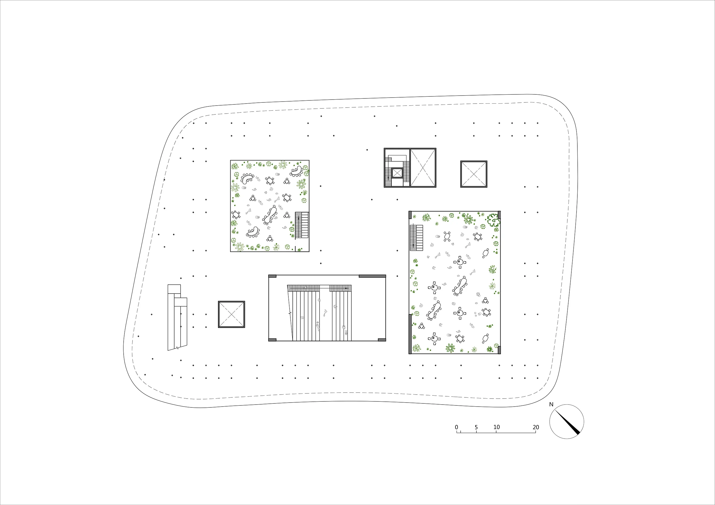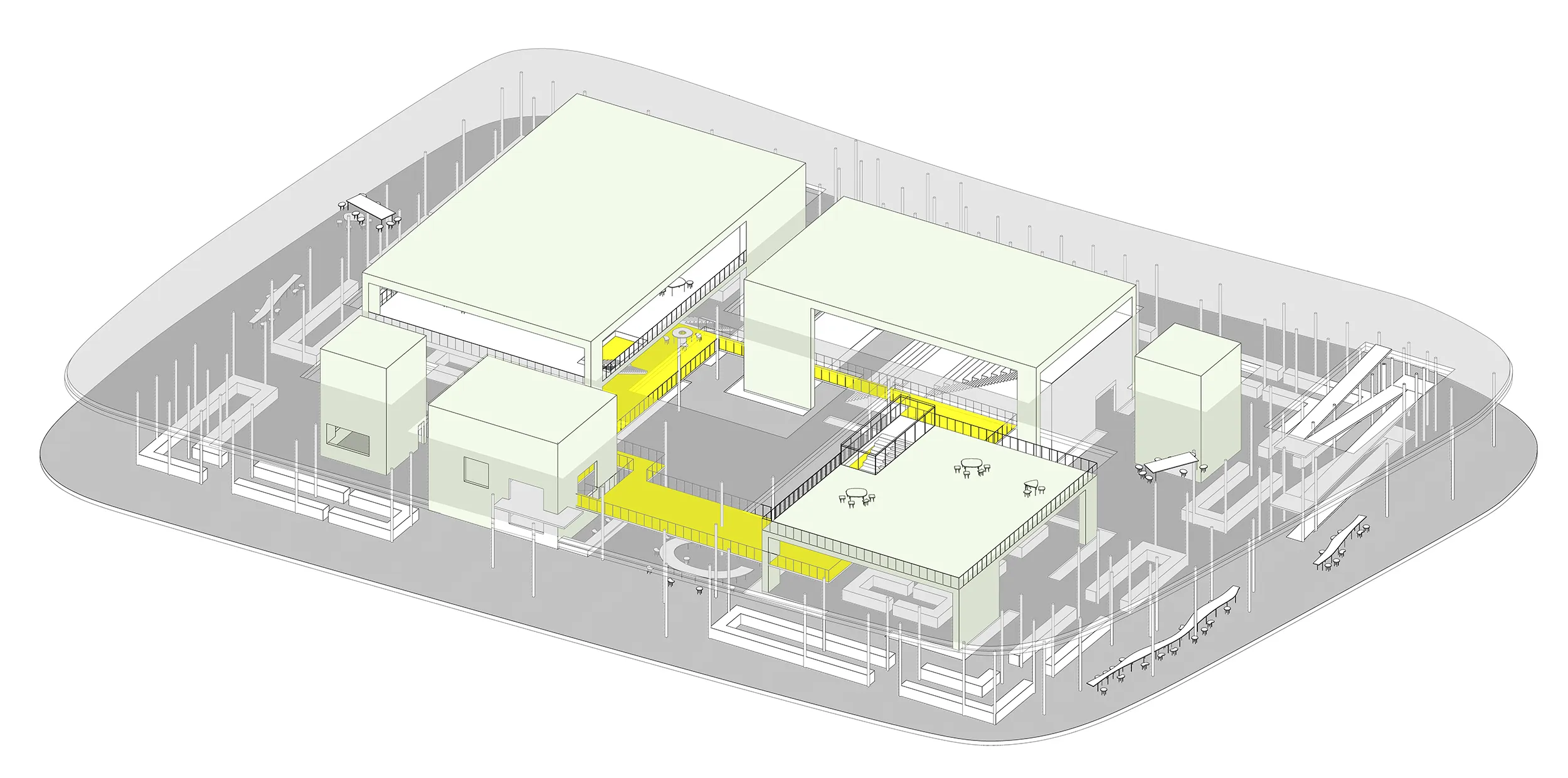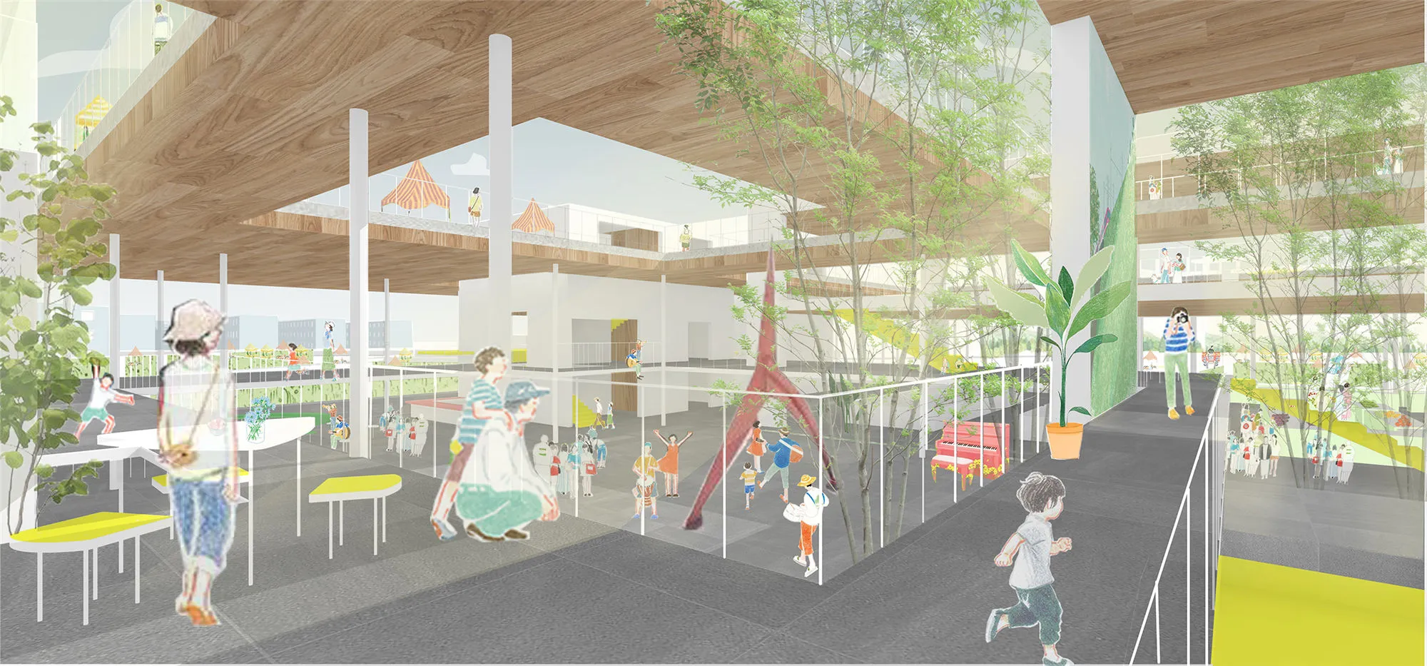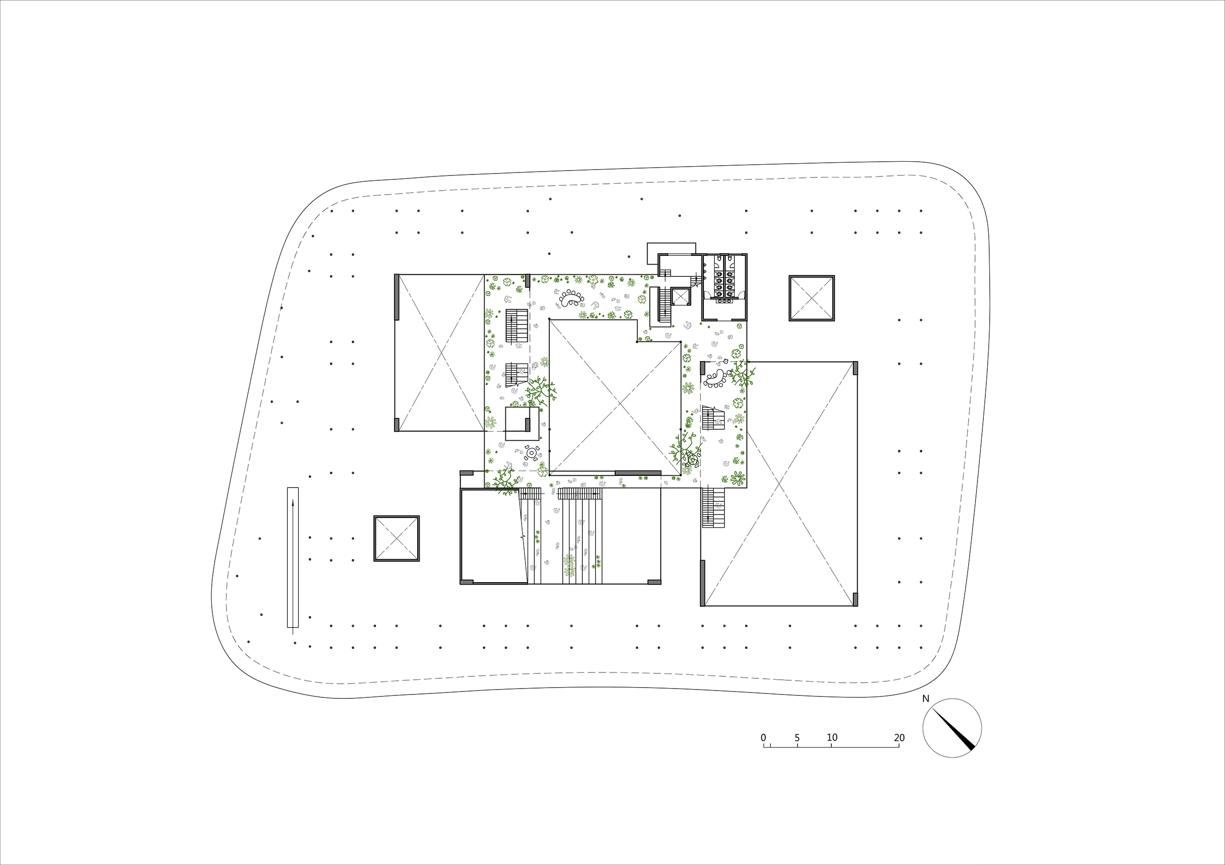 设计的概念源于想让菜场建筑以一种特别开放的姿态面对大众,菜场其本身拥有人们日常生活所必需的使用的功能属性,从来都是不失活力和人群的建筑。但是菜场建筑往往只具有单一的功能属性和单一的使用时间,因此我们希望让建筑能拥有更丰富的功能空间和体验空间来服务当地人以及外来游客,抛弃以往菜场单一的功能和使用时间,采用灵活的开放的大空间,从而达到使用上的多种可能性,诸如中庭空间,可满足多种使用要求,举办当地特色的唱戏活动或各种中小型聚会,宴会或成为当地人休闲娱乐的场所,夹层的多功能阶梯空间,可为当地提供午夜电影剧场活动,举行艺术讨论集会等,屋顶空间一部分成为露台餐厅,成为当地人与外地人交流与休闲的场所,一部分为漫步系统,提供给周边社区散步休闲。建筑外围形成的卖菜区域,菜场融于其中,而不止于此,以一种模糊的定义与渗透的空间边界,从而达到更多的可能性,在空间中融入乡村与城市的多种未知性。采取了完全融入环境的构想,各个空间相互联系又各自分离,保持视觉连续性、空间连续性以及使用的多种可能性。