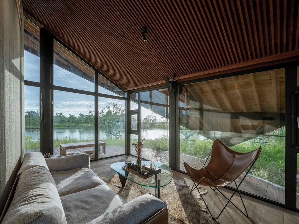 通透的玻璃界面试图将周围的自然毫无保留地呈现在建筑内部,室内的氛围随着时间和季节而变化,自然也成为这栋建筑的一部分。使用者在室内,望见外面的林子与溪流是人与室外自然环境交流的第一种方式。当进入建筑中心的筒中,原本开阔的视野顿时被筒壁所囿,头顶的天窗成了视觉唯一可以得到舒展的出口。当人们在筒内抬头,望向天空,让天光洒向自己的脸上时,人与室外空间交流的另一种方式便得以建立。羽翼一般的屋顶出挑是很大的,双坡垂下仿佛即将接触地面,犹如一只展开翅膀的燕子。延屋脊方向屋顶前高后低,建筑仿佛要以这种飞升的动势飞入大自然的怀抱,我们希望建筑以这种态势与环境发生关系。