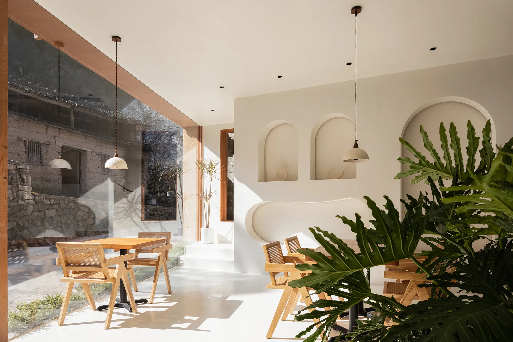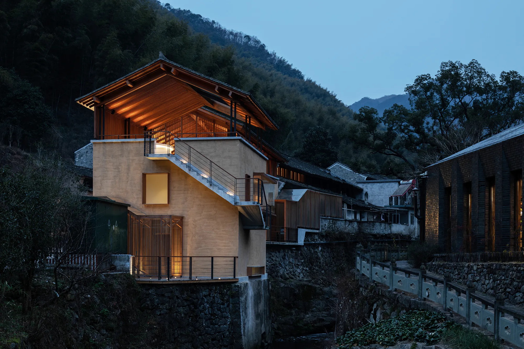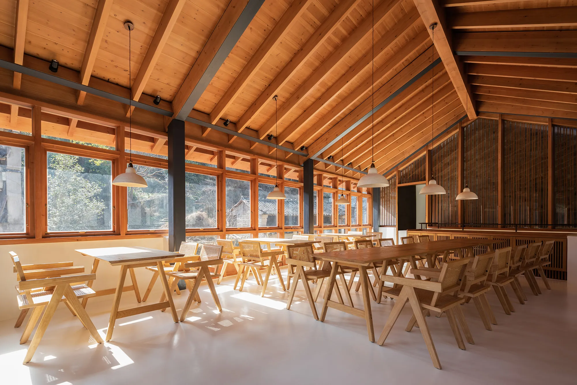 餐厅作为整村文旅民宿综合体配套公区的一部分,位于进村就能看到的溪边,由一个发电站改造加建而成。进村道路不宽,只有3米多,一侧是高起来的地形石坎,为保持街道的整体性,我们将建筑的外边界线控制在老建筑的边界内。餐厅的正立面朝向村道,建筑的一层用整体的大玻璃面向街道打开,沿用老房子的界面往里退让。大玻璃面让建筑的一层空间和街道之间发生更多紧密的关系,里外互动,空间渗透。同时过往的路人也能轻松的关注到餐厅水吧空间,很自然得被吸引进来。