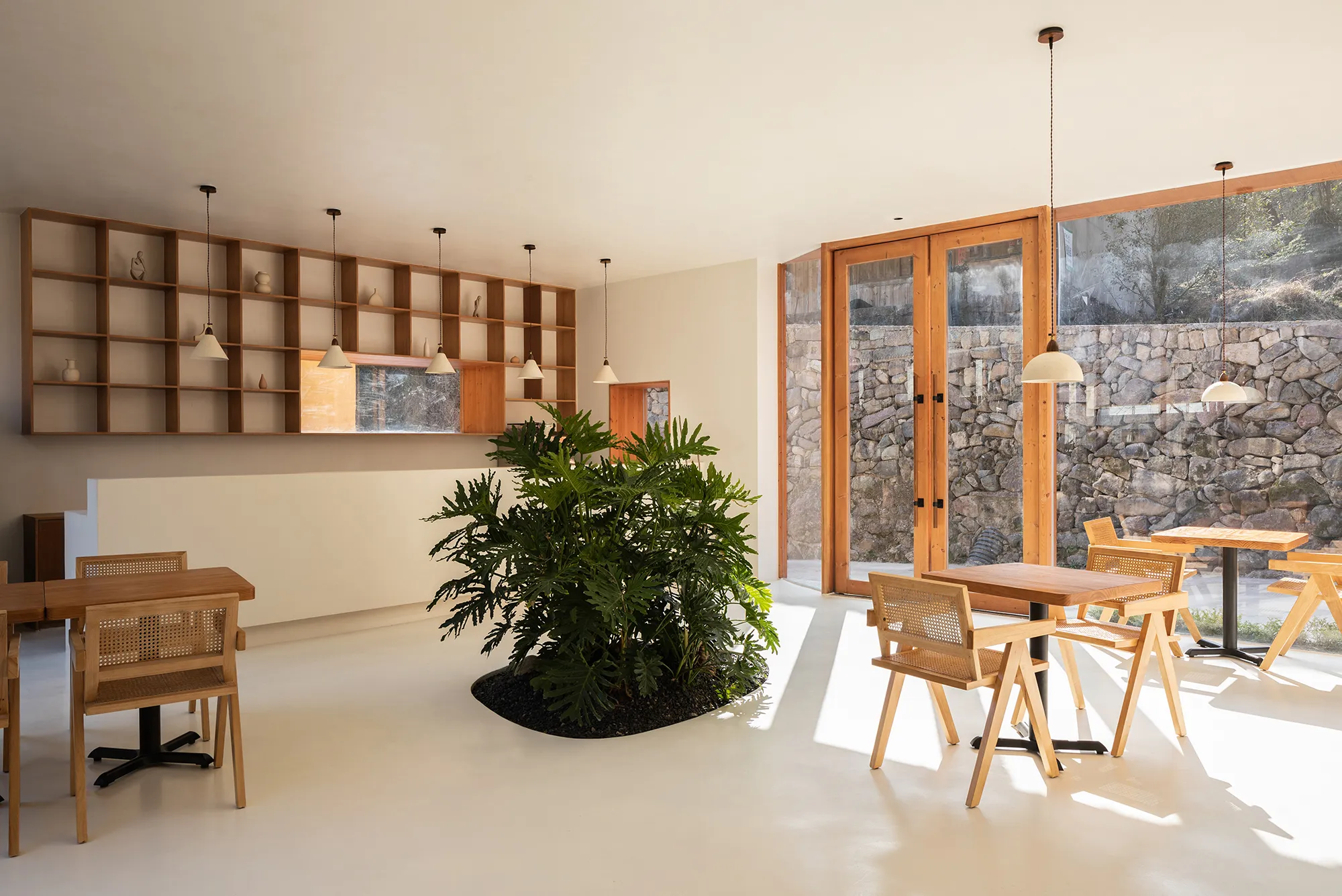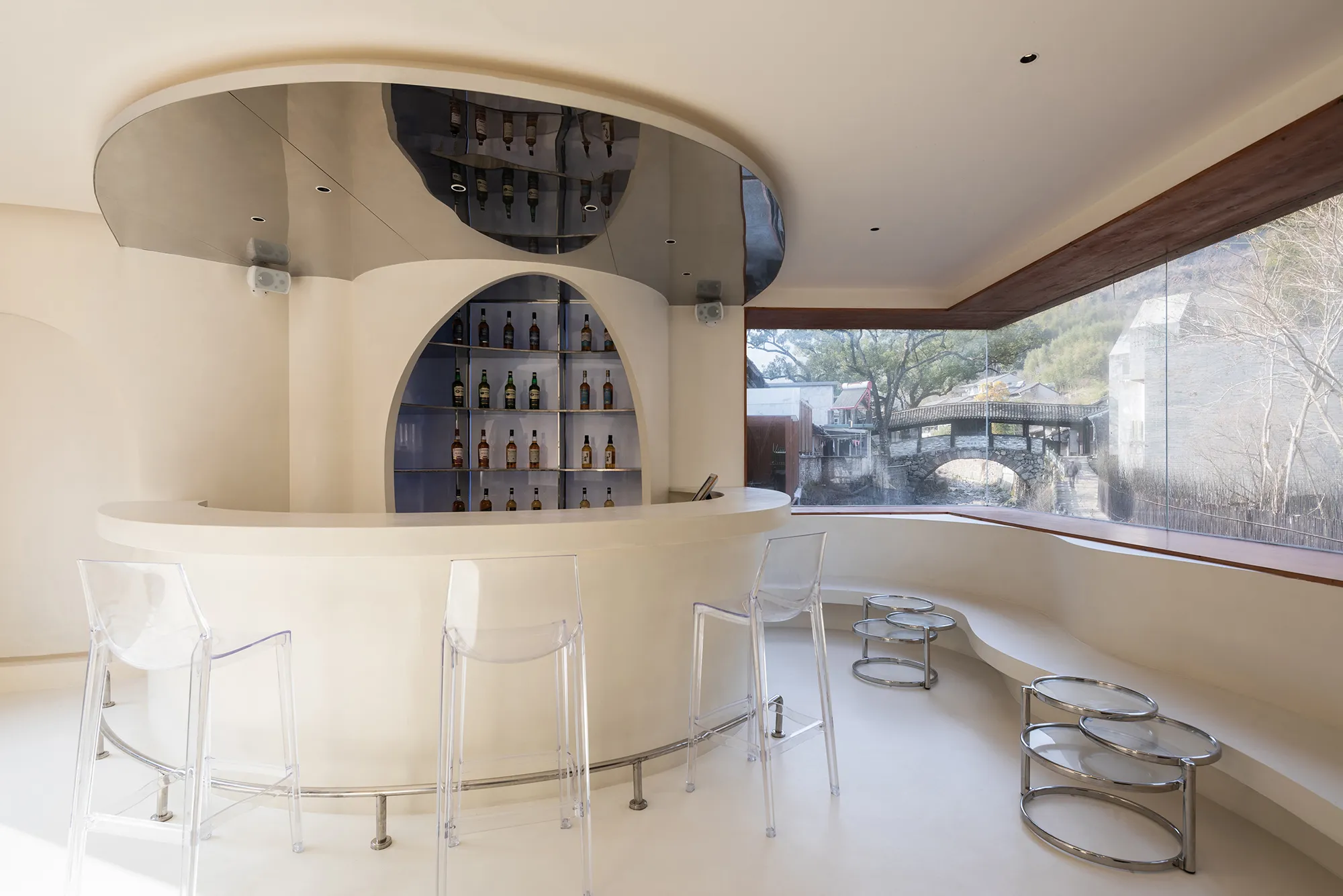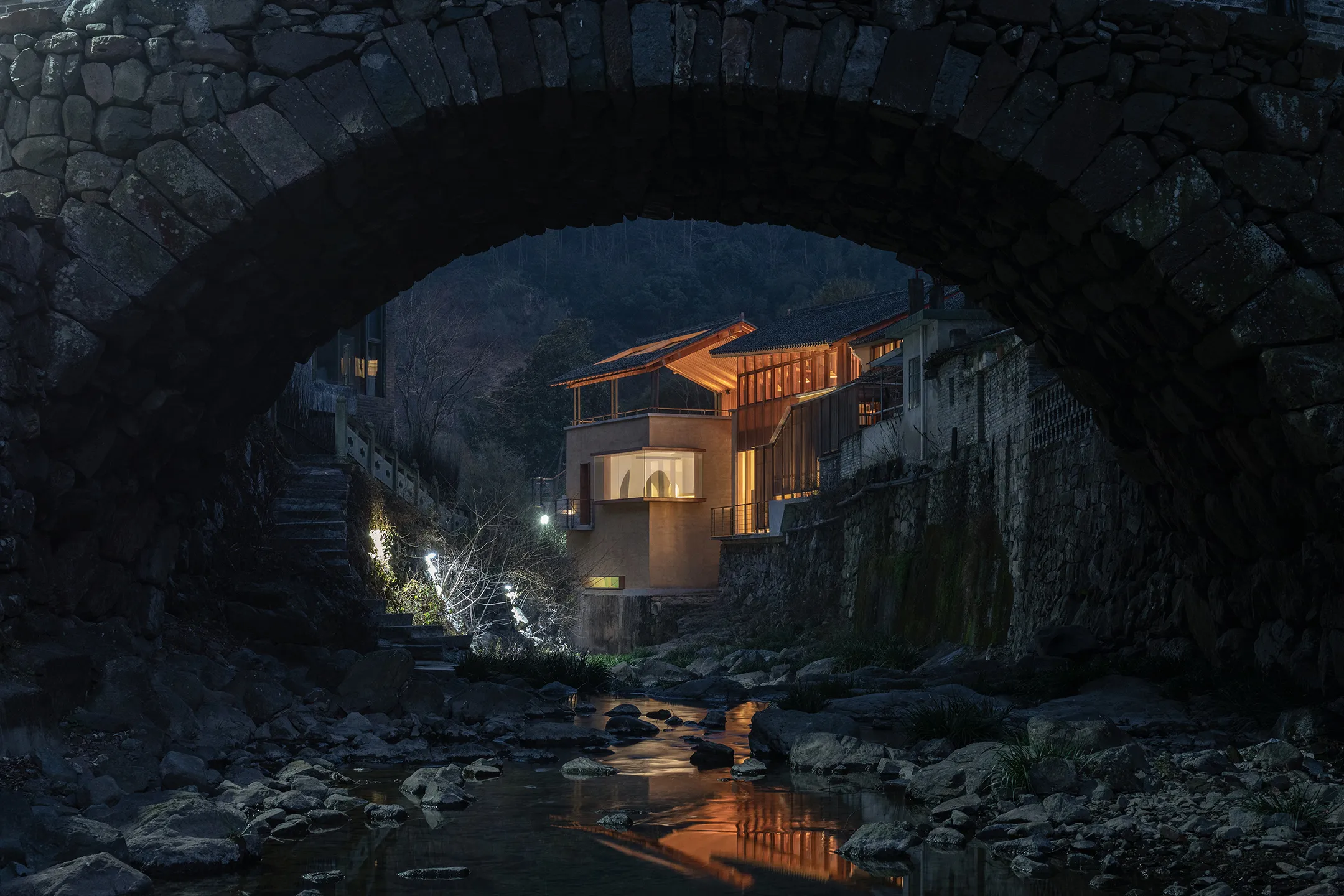 餐厅作为整村文旅民宿综合体配套公区的一部分,位于进村就能看到的溪边,由一个发电站改造加建而成。进村道路不宽,只有3米多,一侧是高起来的地形石坎,为保持街道的整体性,我们将建筑的外边界线控制在老建筑的边界内。餐厅的正立面朝向村道,建筑的一层用整体的大玻璃面向街道打开,沿用老房子的界面往里退让。大玻璃面让建筑的一层空间和街道之间发生更多紧密的关系,里外互动,空间渗透。同时过往的路人也能轻松的关注到餐厅水吧空间,很自然得被吸引进来。