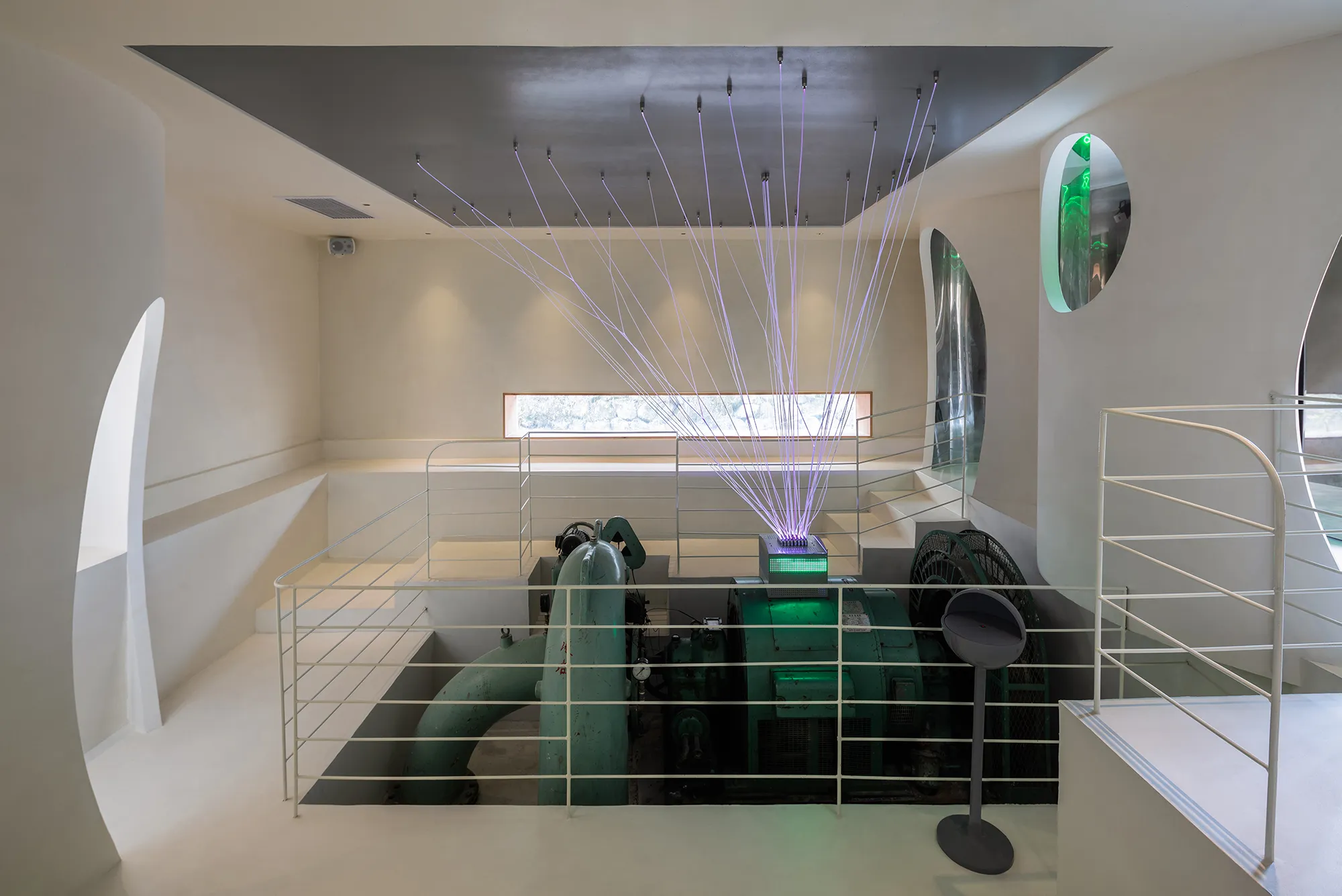 发电站酒吧的基座标高很低,进入即是一个下沉式的环绕发电机的空间。利用高差关系,酒吧顶层做了一个半室外的活动空间,与餐厅二层相连,可做为餐厅空间的延伸,进行复合使用。外挂楼梯将酒吧和餐厅串联起来,弱化了功能之间的边界,使两个空间既联动又独立,实现灵活使用,空间共享。