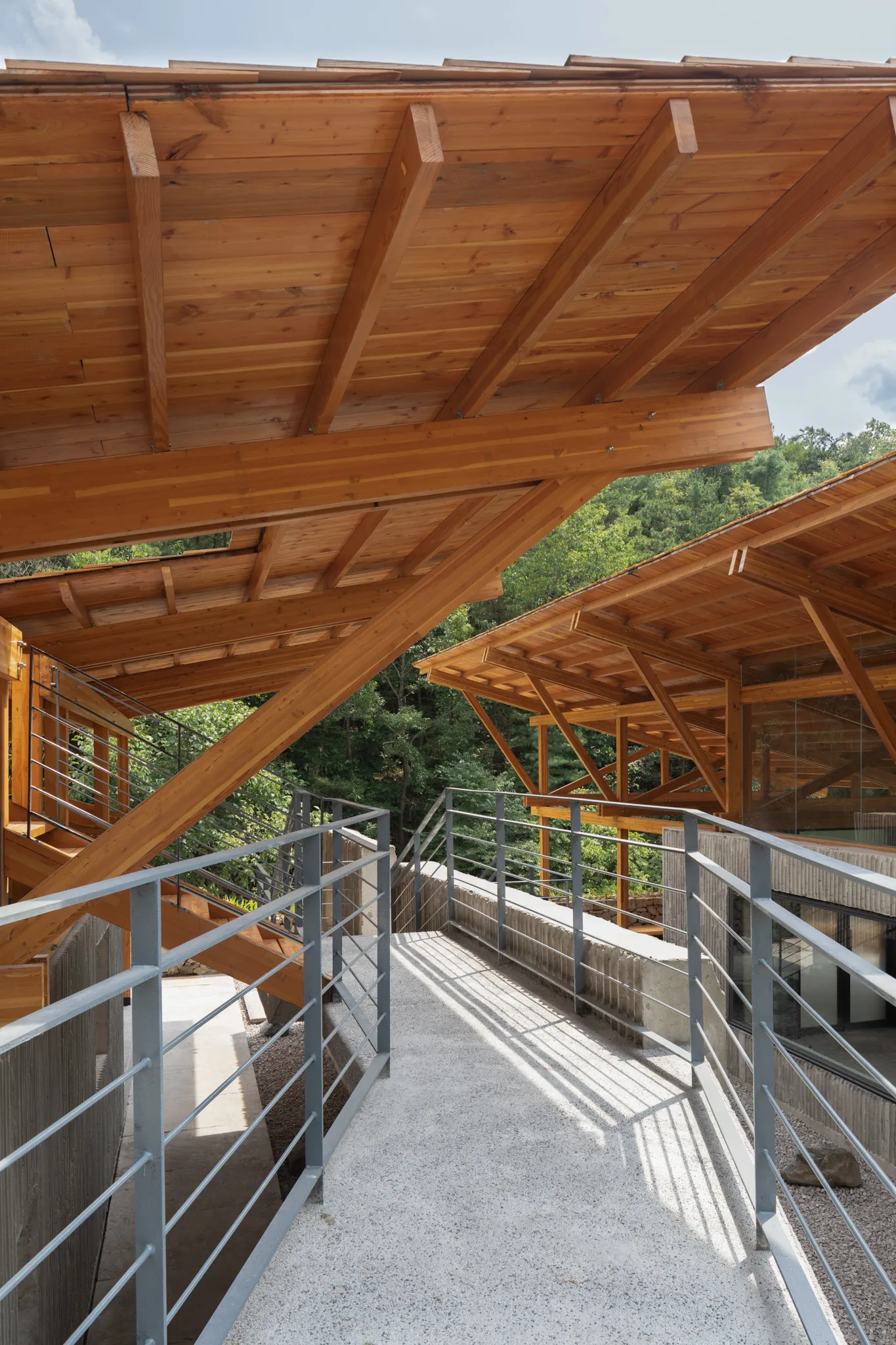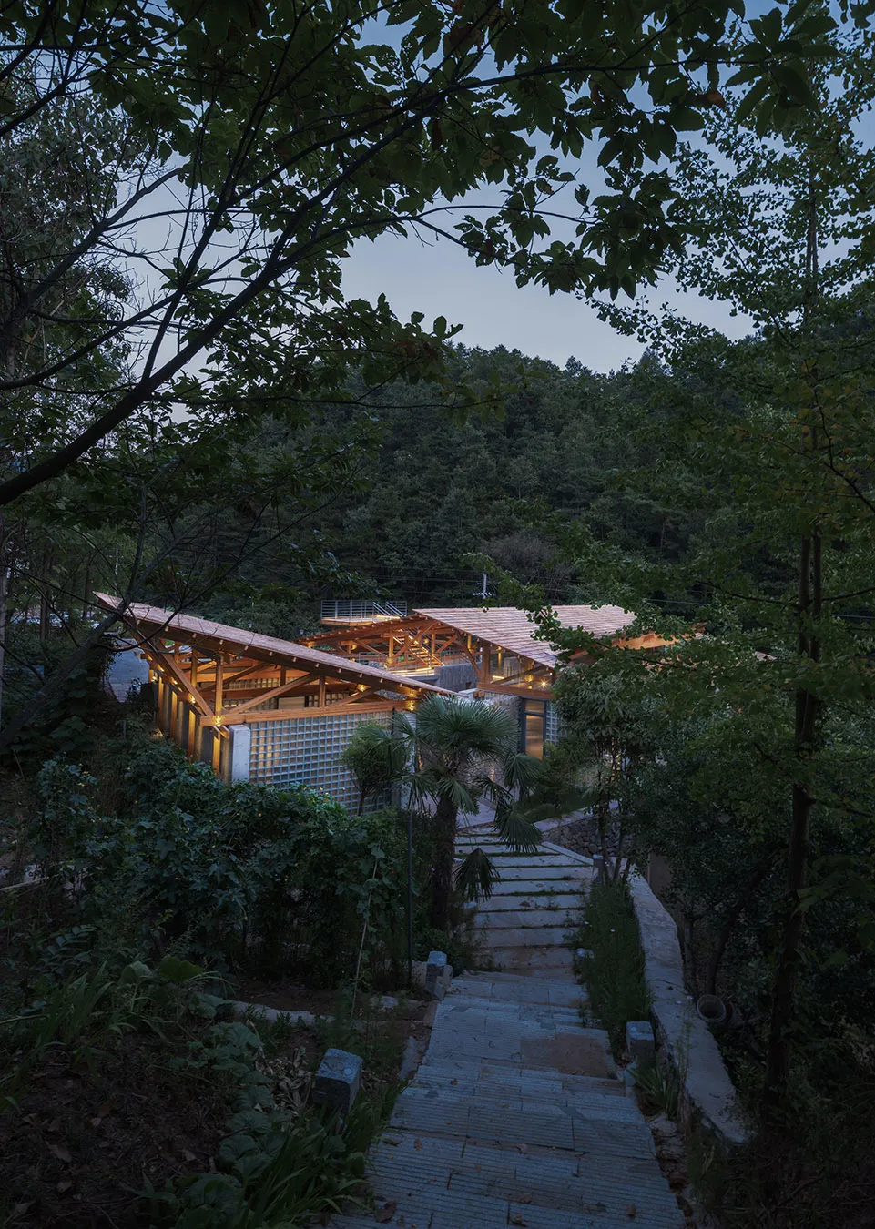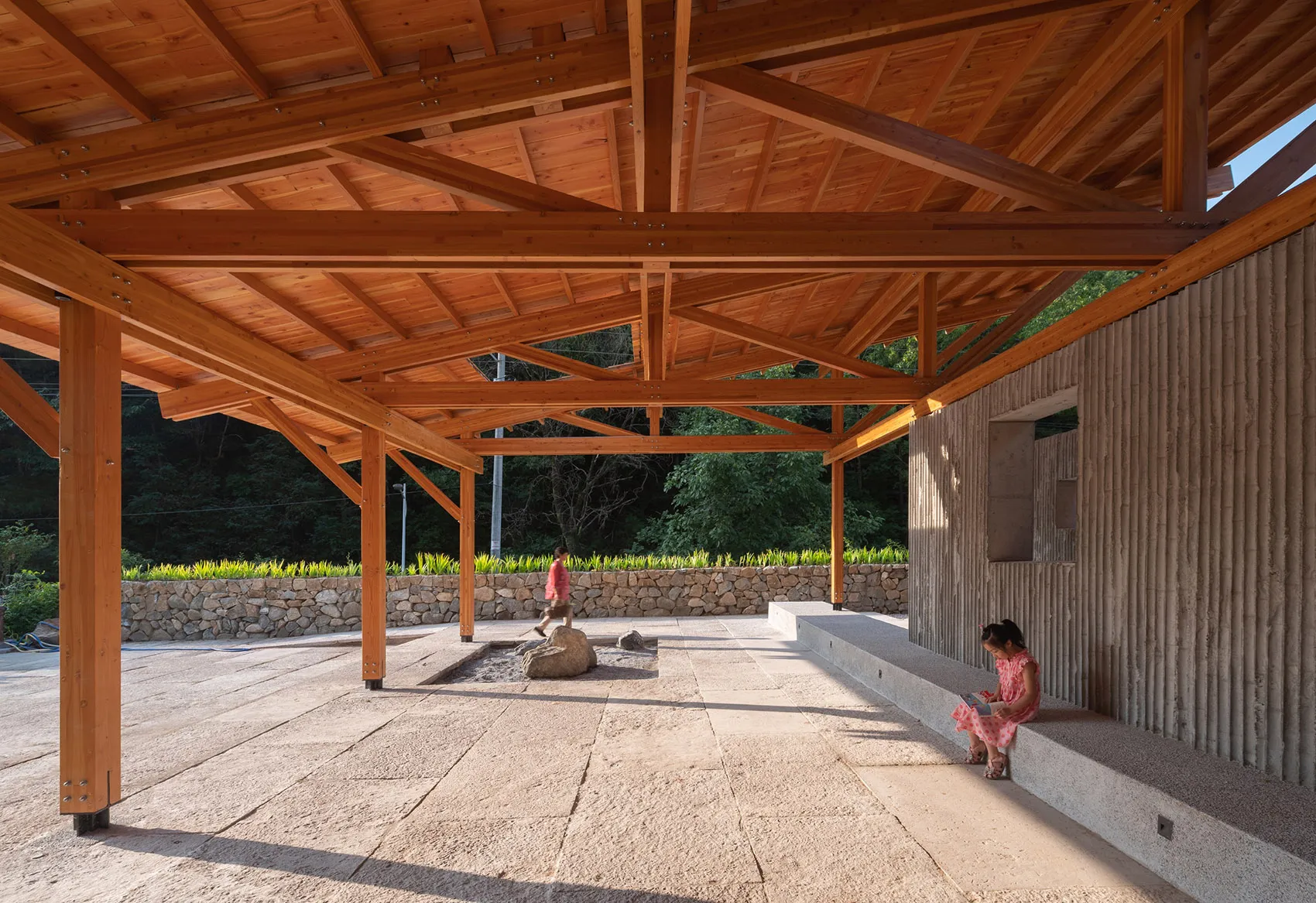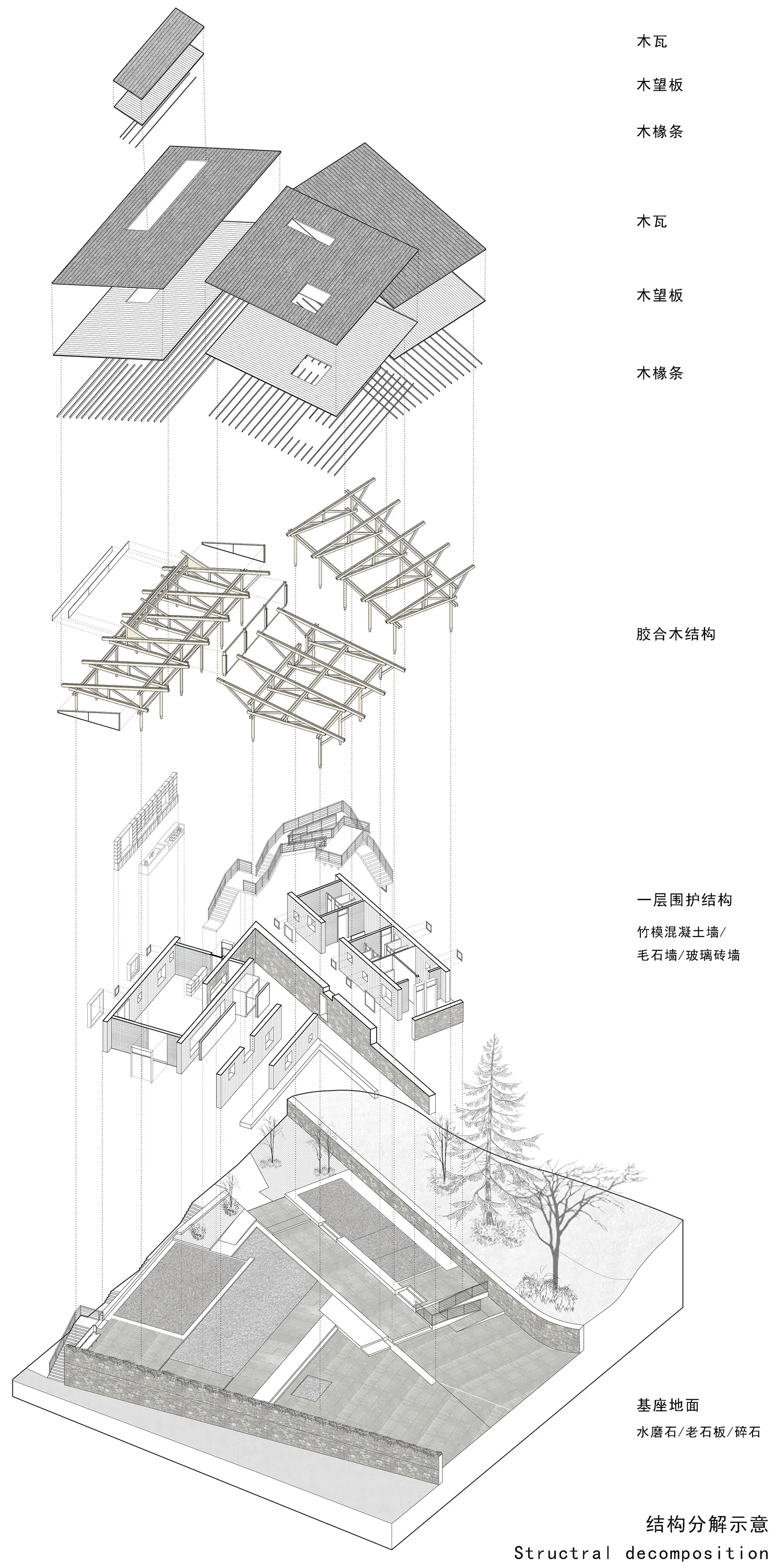 建筑设计将房子的基本要素拆分的很清晰,屋顶,结构,墙体,地面。使用空间分布在三片大屋顶之下,分别是接待公区、开放的公共空间、公共卫生间,三个功能既相互独立又发生关联,有机的组织在一起,大屋顶由预制化设计的胶合木结构屋架构建而成,不同的尺度,同一种设计逻辑和形制进行重复和演变,类似于中国传统的木构建筑,在连续阵列的屋架中产生变化,设计研究了一榀标准屋架,然后将屋架进行阵列,根据空间尺度形成尺度变化,就形成了三个基础的木结构屋架空间体系。