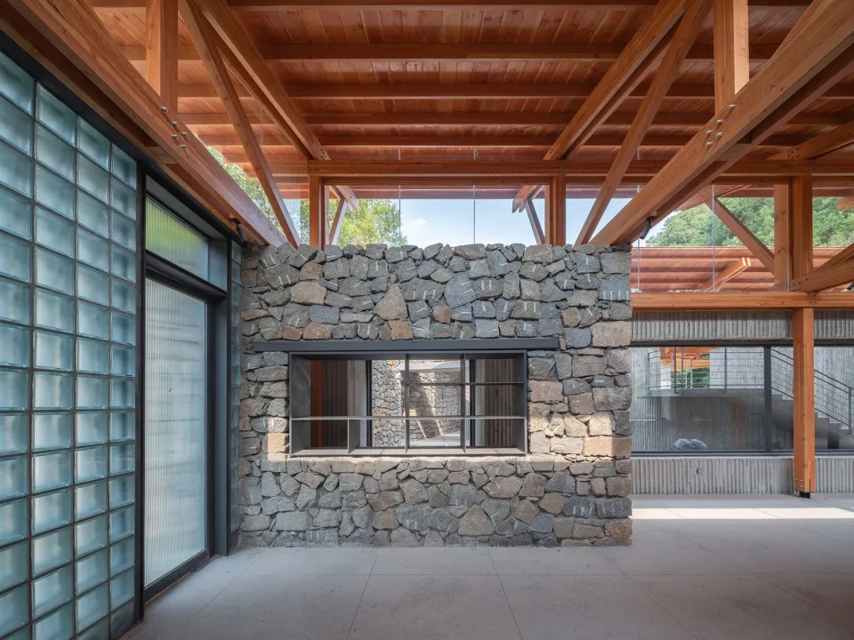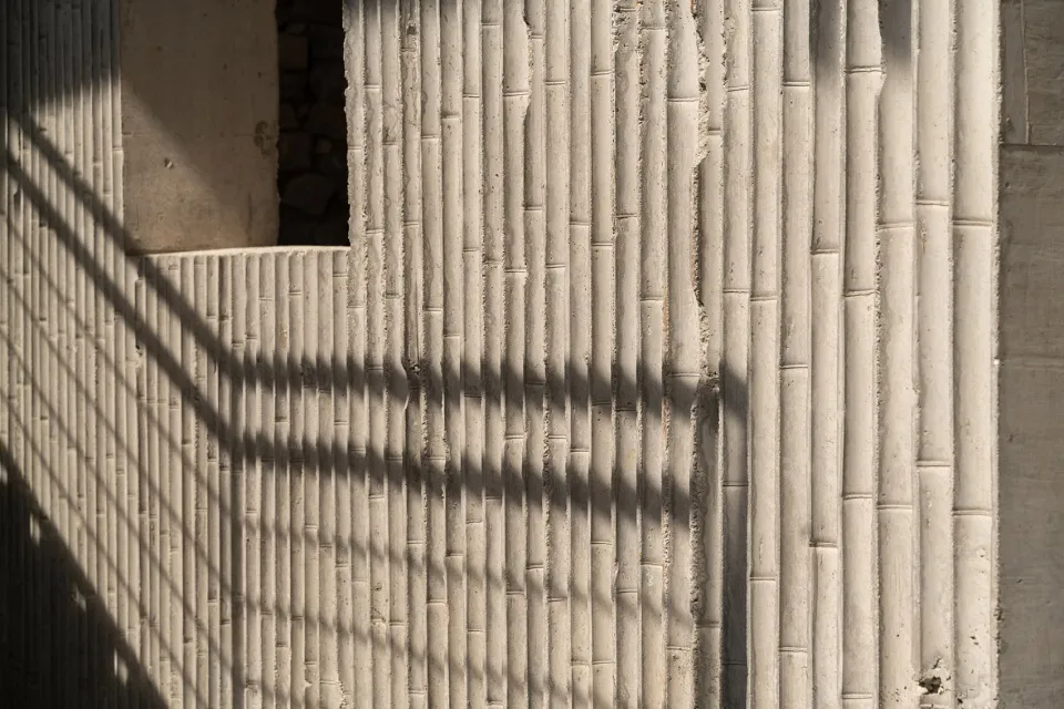 建筑给人的感受是靠空间、光影、材质、体验等综合体现出来的,材质之间的碰撞,除了颜色光影,还有质感触觉。建造过程中竹模混凝土刚拆模的时候我是有点失落的,品质没有想象中好,但是也没急着让做修复,就放着边做边看,当木结构架起来,玻璃砖做好的时候,我再回看竹模混凝土的粗糙感觉得就没有问题了。毛石垒墙做完之后,竹模混凝土粗糙的感觉更好了,材料的层次反而体现出来了。当光影打在墙面上,这种水纹投影特别生动。细腻和粗犷是相对存在的,高密度的细腻会让人觉得不自在,太过粗糙没有细节又会觉得很简陋,这种度的把握和关系的控制非常重要,建筑师的个人感受也很关键,对现场做的每个决定都会影响建筑完成后的整体气质。