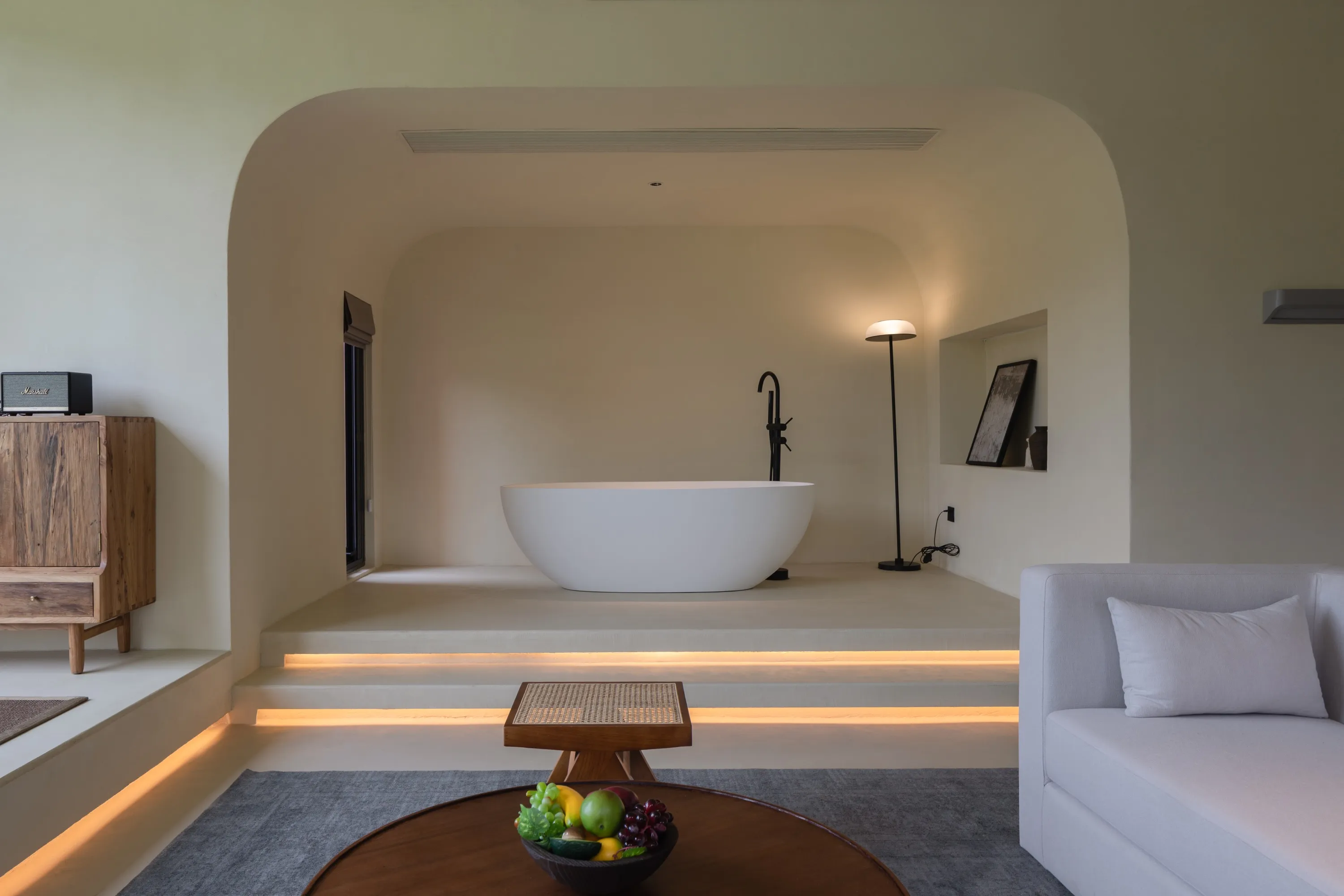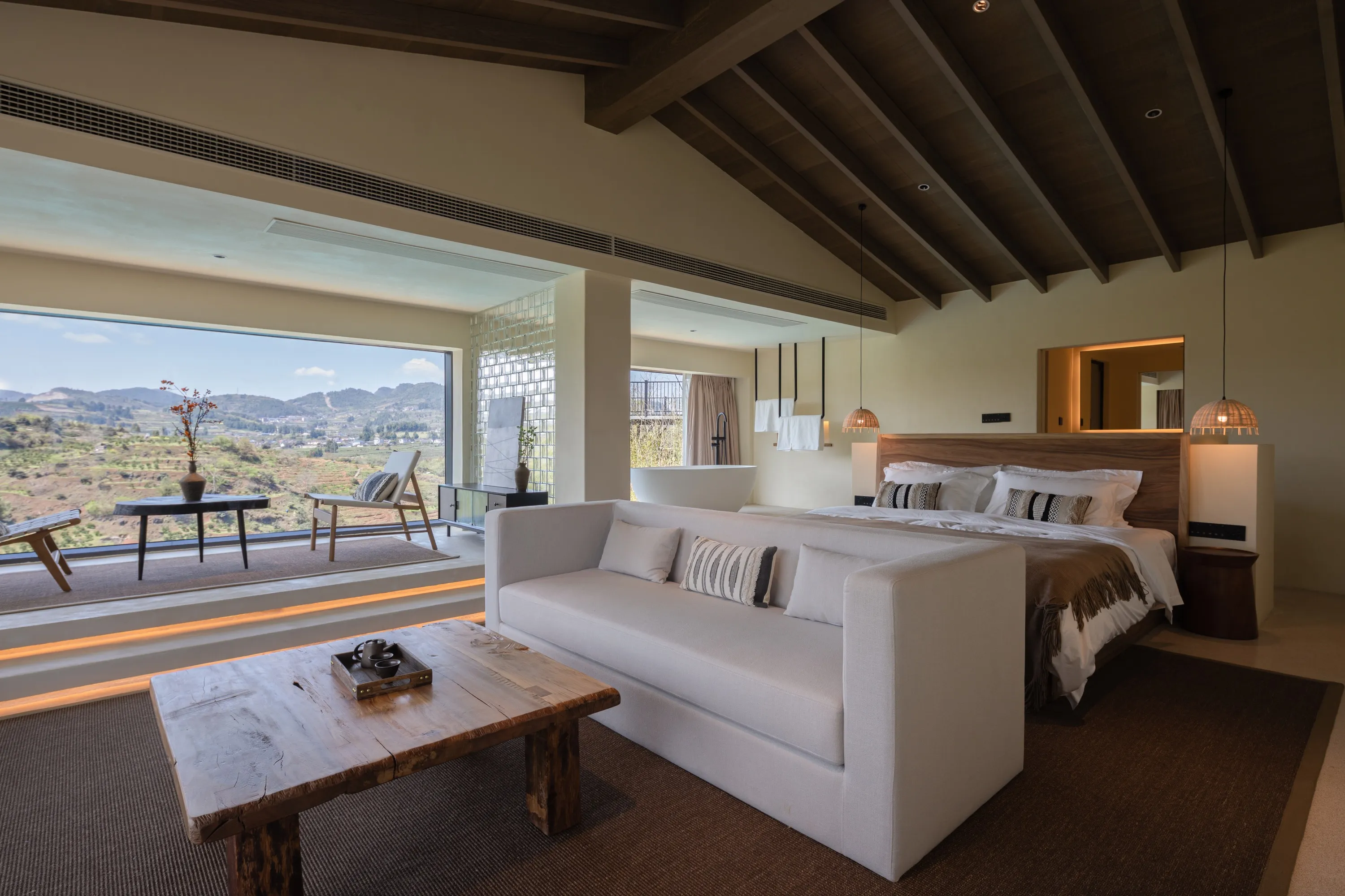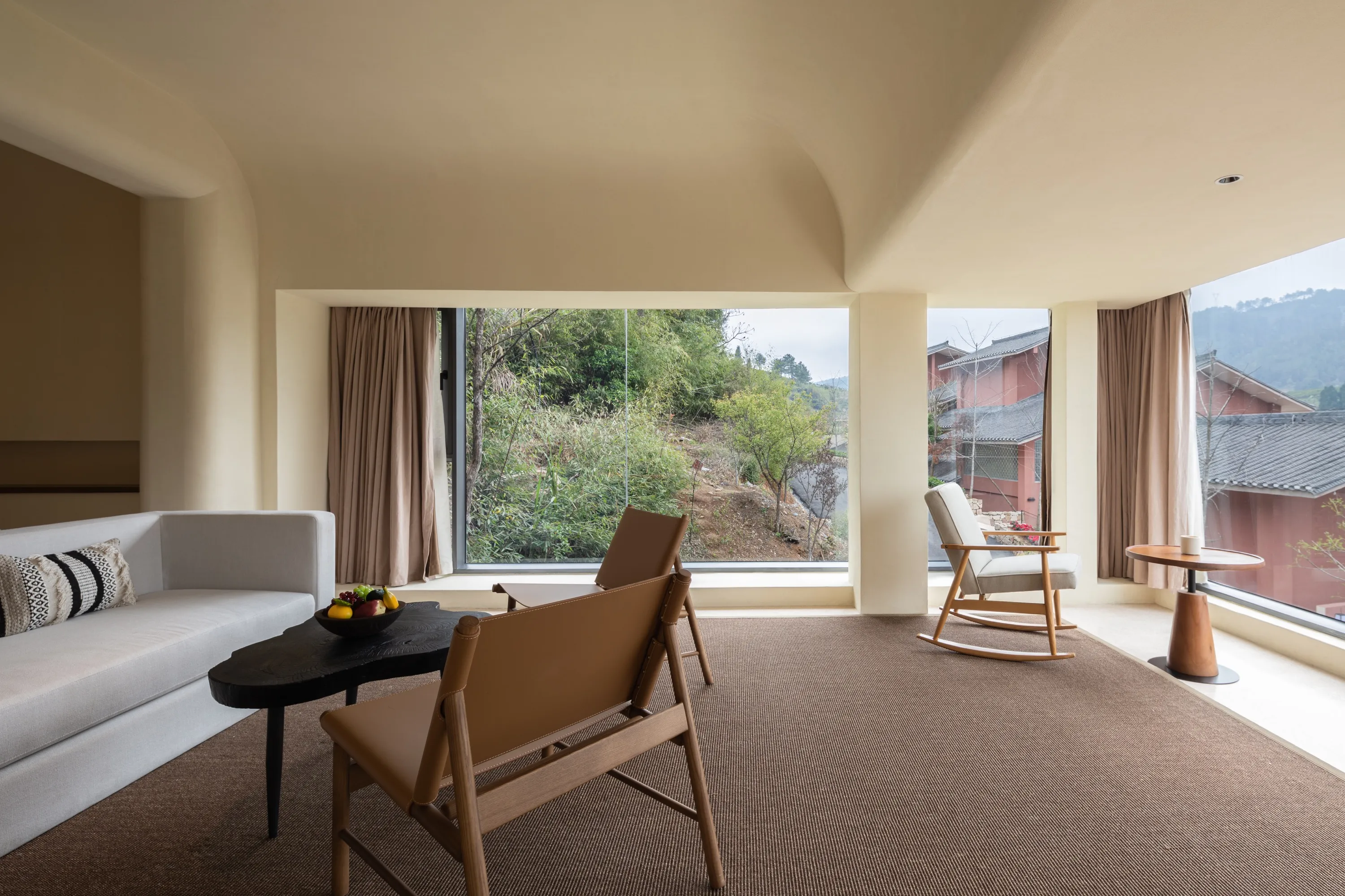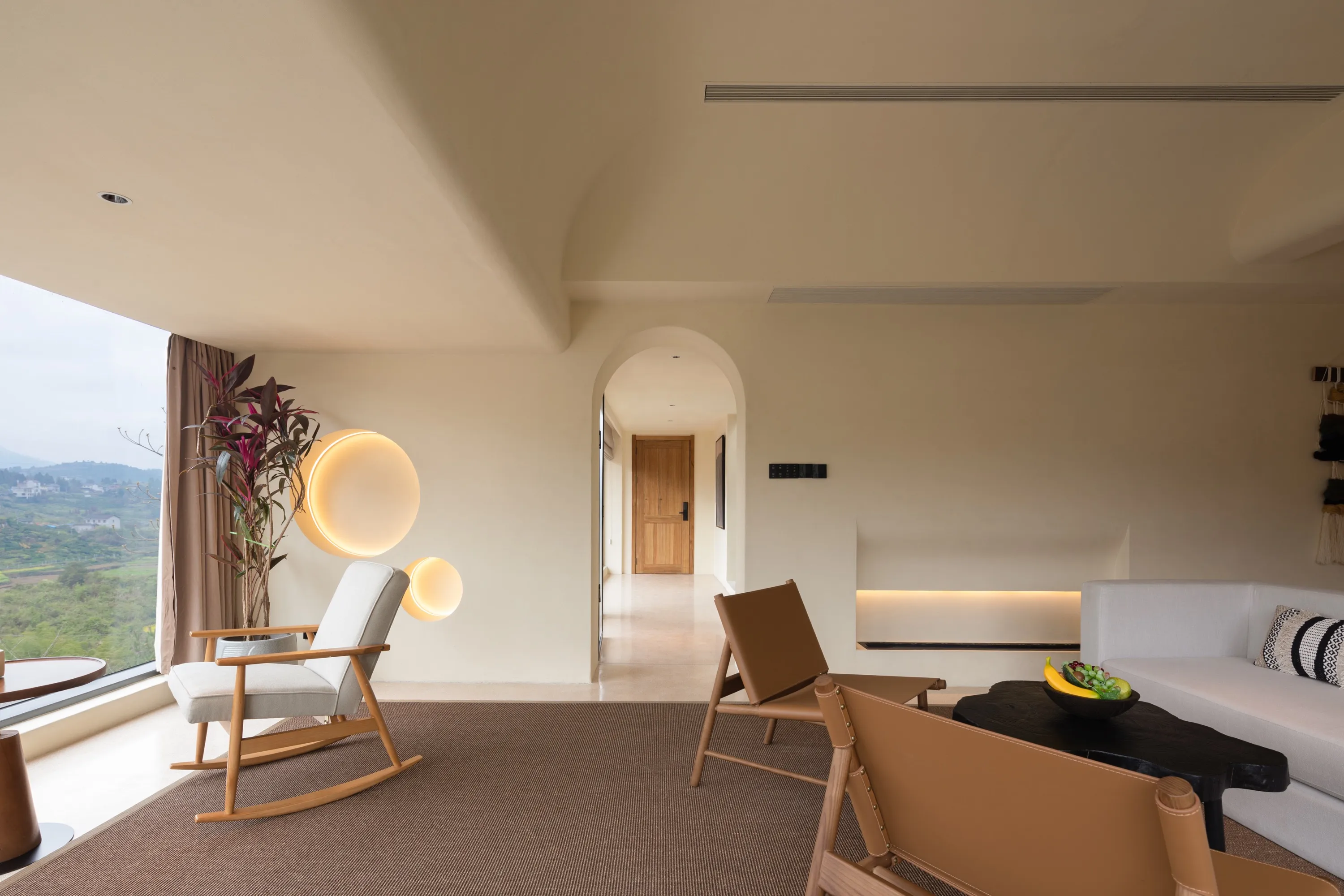 与公区不同,客房的设计将更加注重私密性,同时要将外部景色融入到客房内。我们采用了大面积的玻璃墙。客人能够坐在客房内,俯瞰遥远的山脉。在空间设计上,我们坚持采用简约的手法,以创造舒适和自然的氛围。客房的设计在保证景观视野的同时兼顾了私密性。同时采用了一些弧形的元素,将墙壁、天花板和地面无缝连接,创造出连续的空间界面,使人感觉包裹其中。
