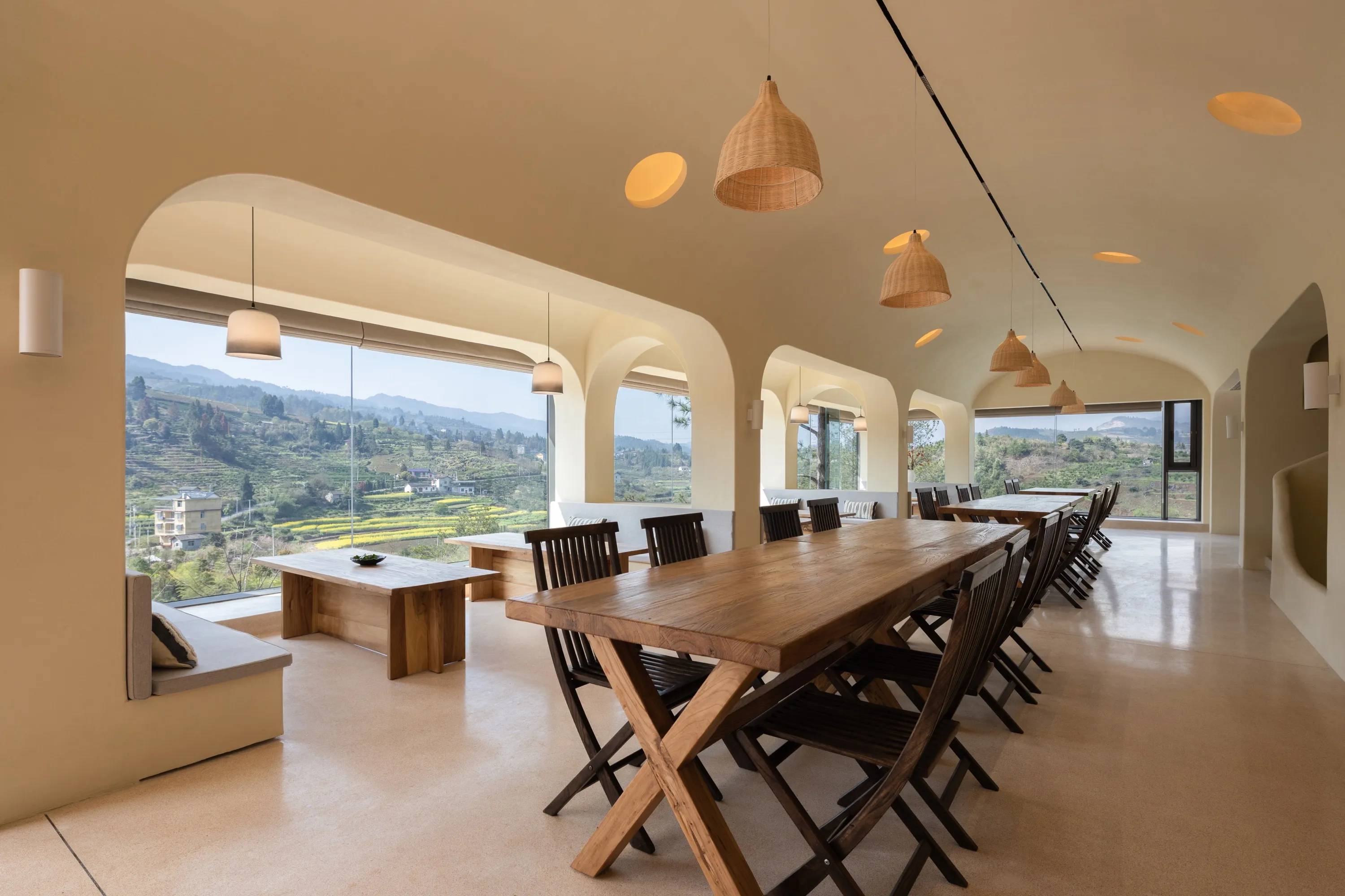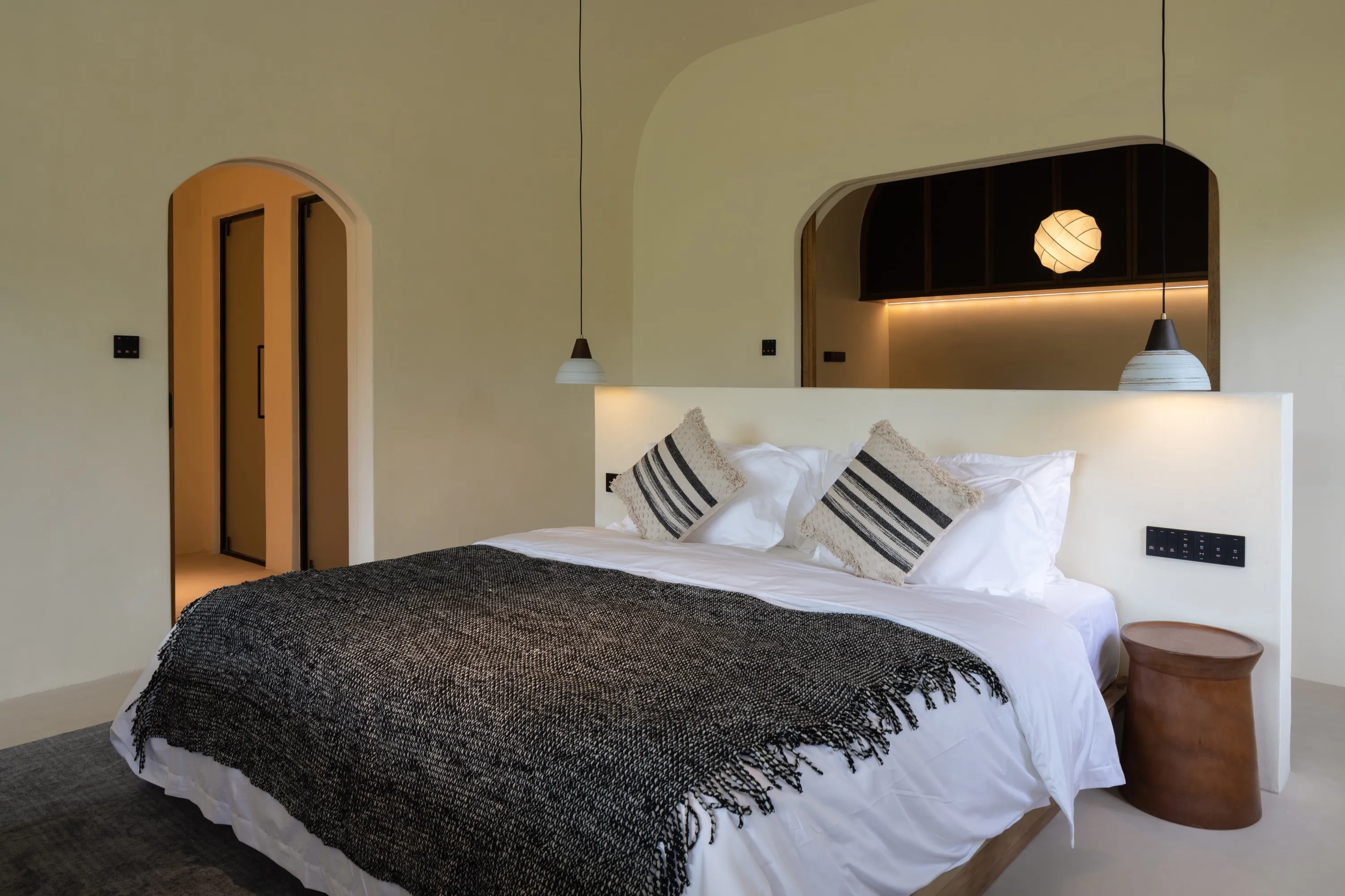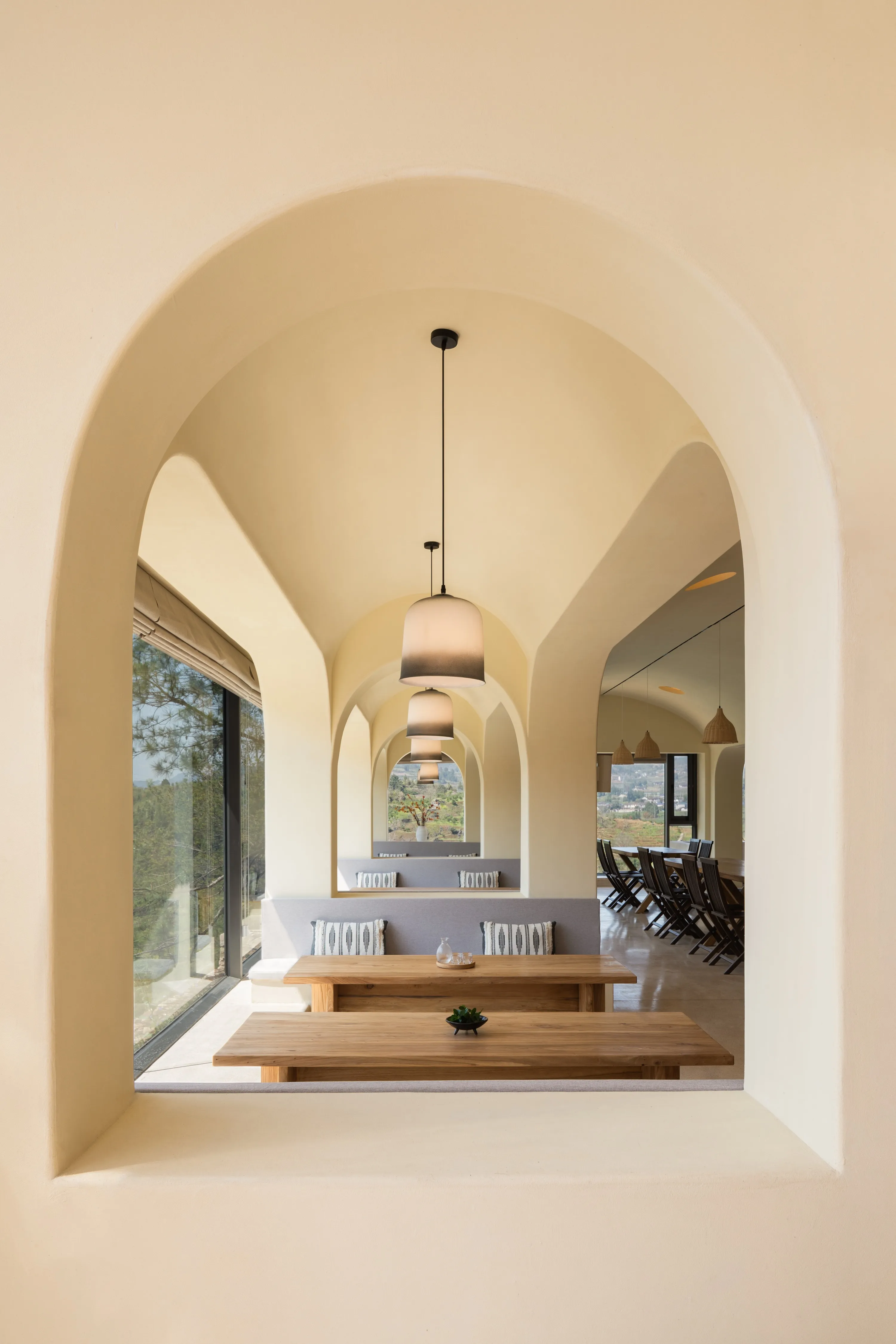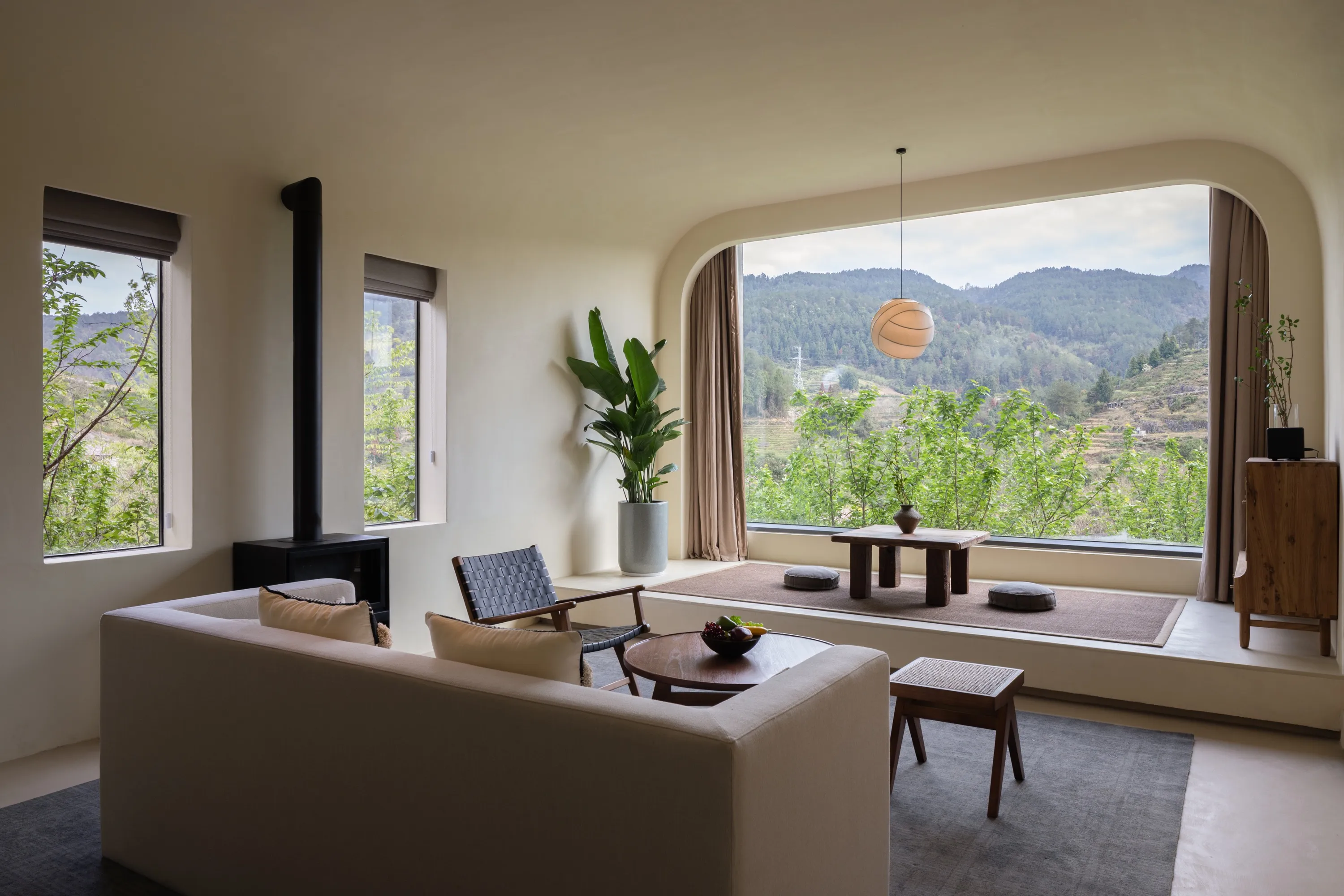 与公区不同,客房的设计将更加注重私密性,同时要将外部景色融入到客房内。我们采用了大面积的玻璃墙。客人能够坐在客房内,俯瞰遥远的山脉。在空间设计上,我们坚持采用简约的手法,以创造舒适和自然的氛围。客房的设计在保证景观视野的同时兼顾了私密性。同时采用了一些弧形的元素,将墙壁、天花板和地面无缝连接,创造出连续的空间界面,使人感觉包裹其中。