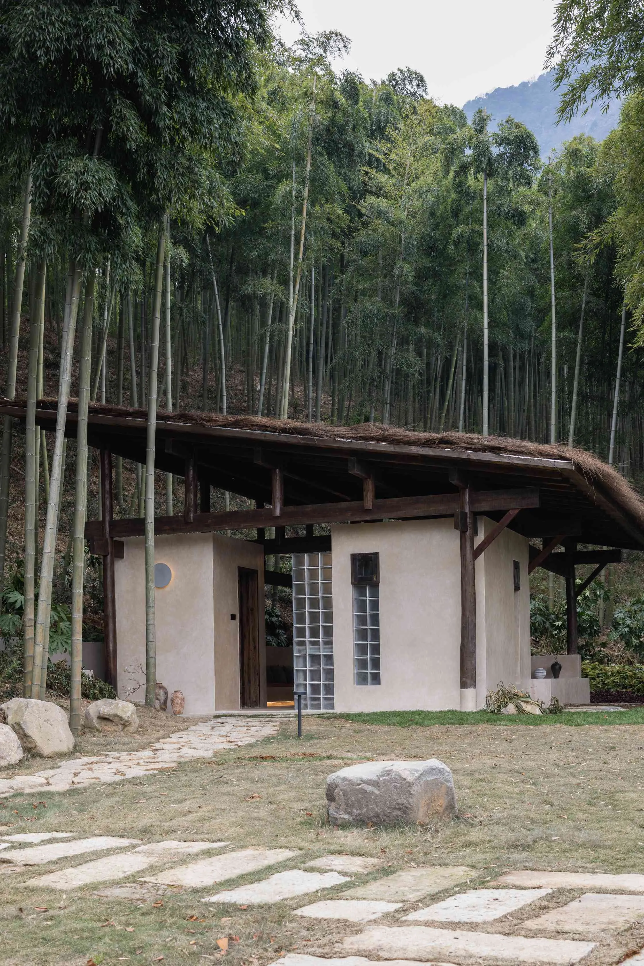 “隐于野,在山川”是民宿的主题理念,设计的初衷就是希望让汤屋的存在感消失,融于场地的山林环境之中,好似自成一脉的避世乡野草屋,在山林中若隐若现,为客人带来一份远离尘嚣的宁静与自在。