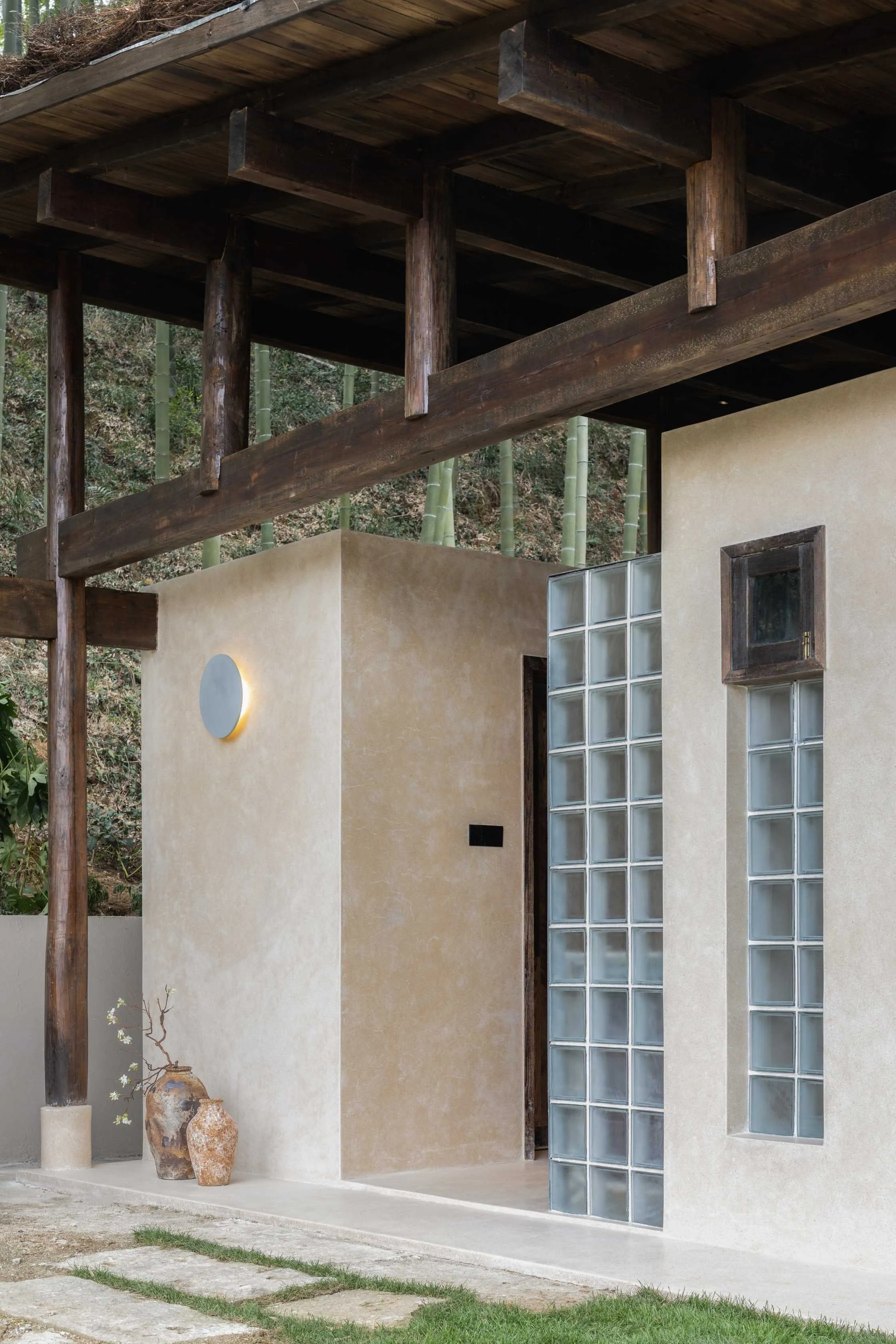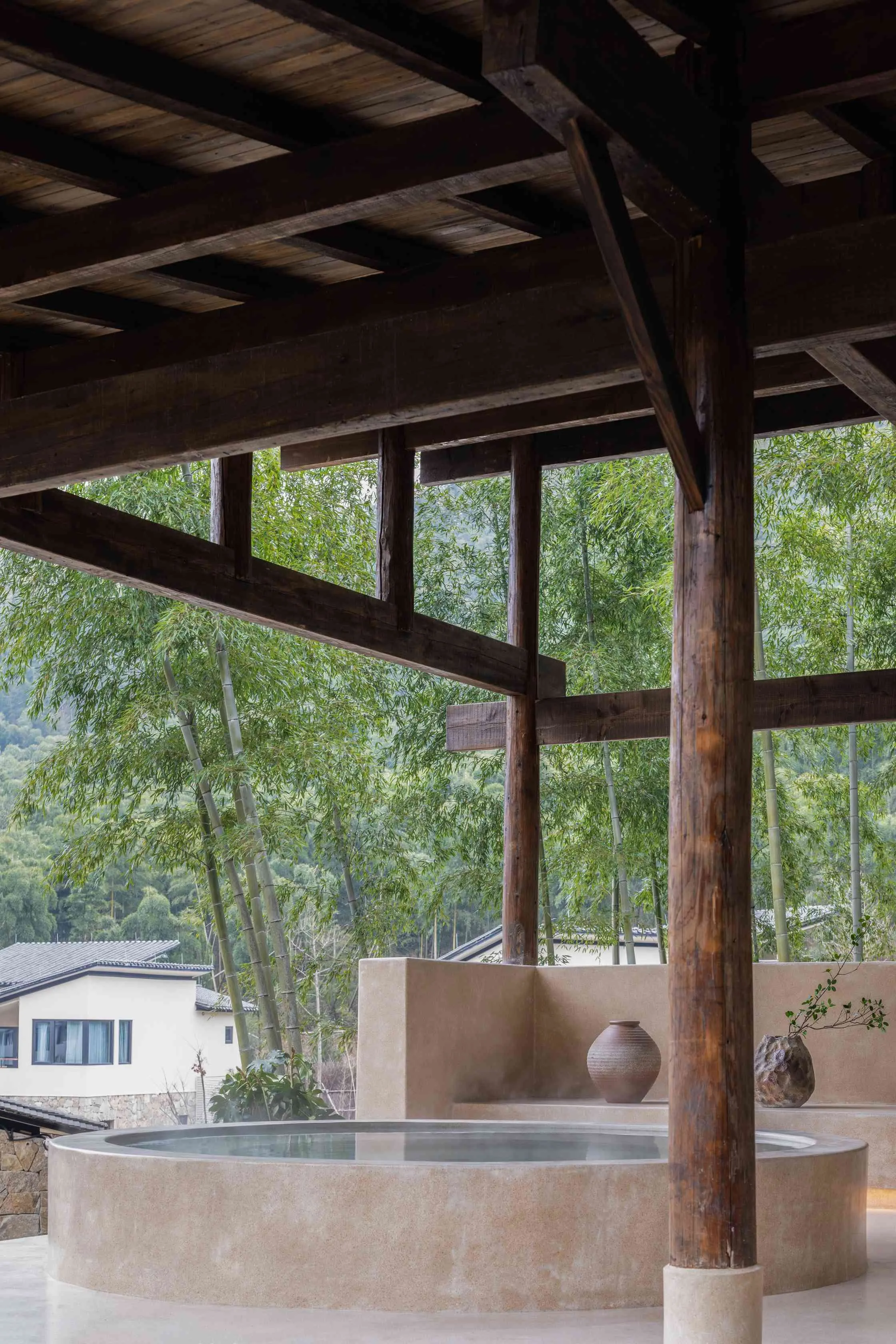 两个独立的汤屋,除了汤池本身,还有更衣淋浴、卫生间和休闲区等功能区域。这些设施的设计既考虑了实用性,又注重了舒适性和美观性。汤屋为了最大程度地将周围的自然景观借入,配套功能性空间围合的墙体只做到半高处,顶盖用玻璃遮盖,起到封闭作用的同时能够满足采光的需求,汤池保留上部木构的完整性和开放感,使客人在泡汤的同时能够欣赏到周围的竹林景观。配套空间窗户的形式采用了木制窗与玻璃砖结合,既保证了内部的私密性又满足了空间的通风需求。两个泡池一方一圆,一大一小,能满足不同容量的使用需求。泡池地面墙面,米色水磨石一统,光洁大气,既显档次又便于打理。泡汤区半室外开放,雨落竹林,私汤伴雨声,身心与自然合为一体,尽享极致放松。