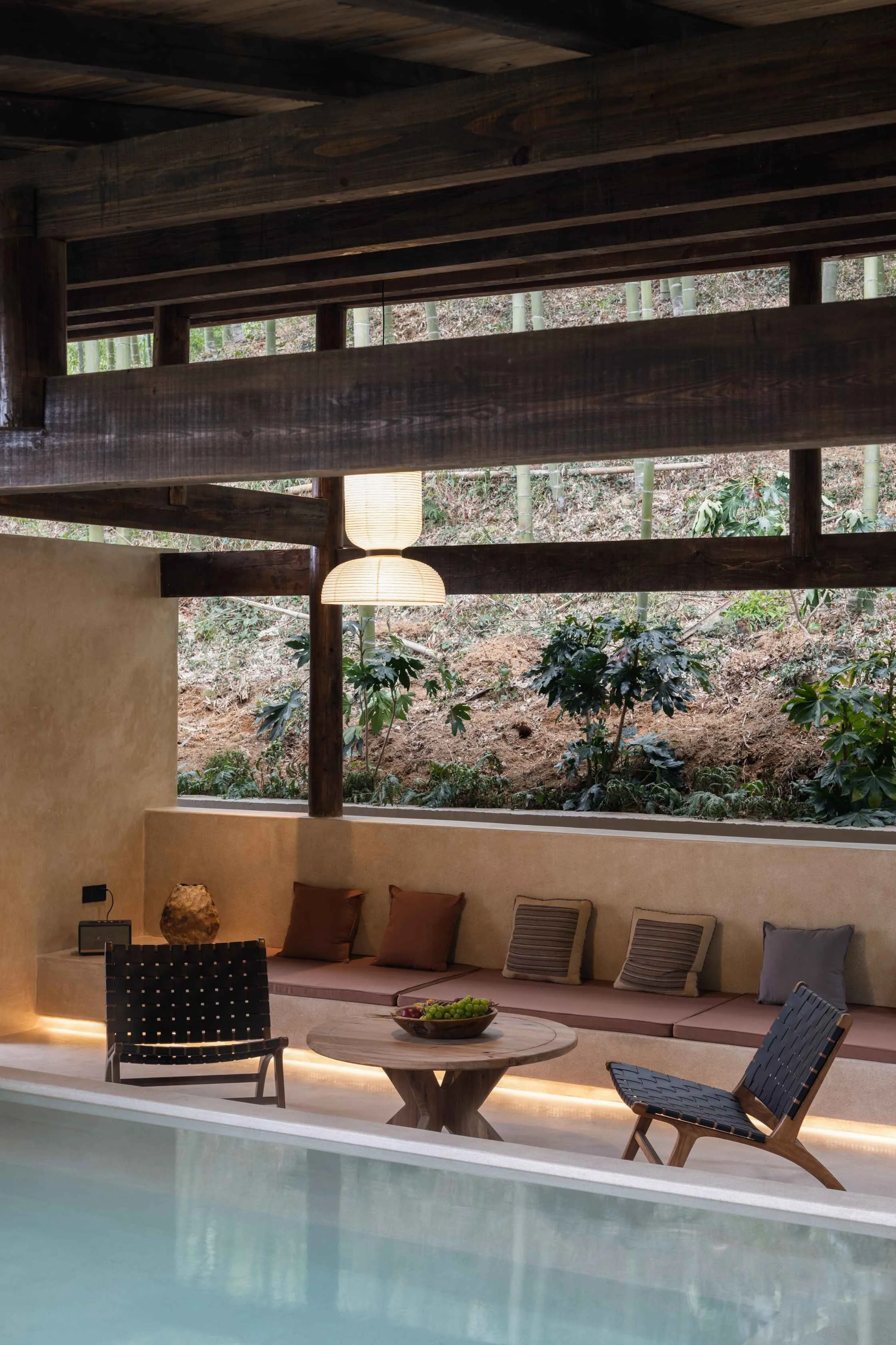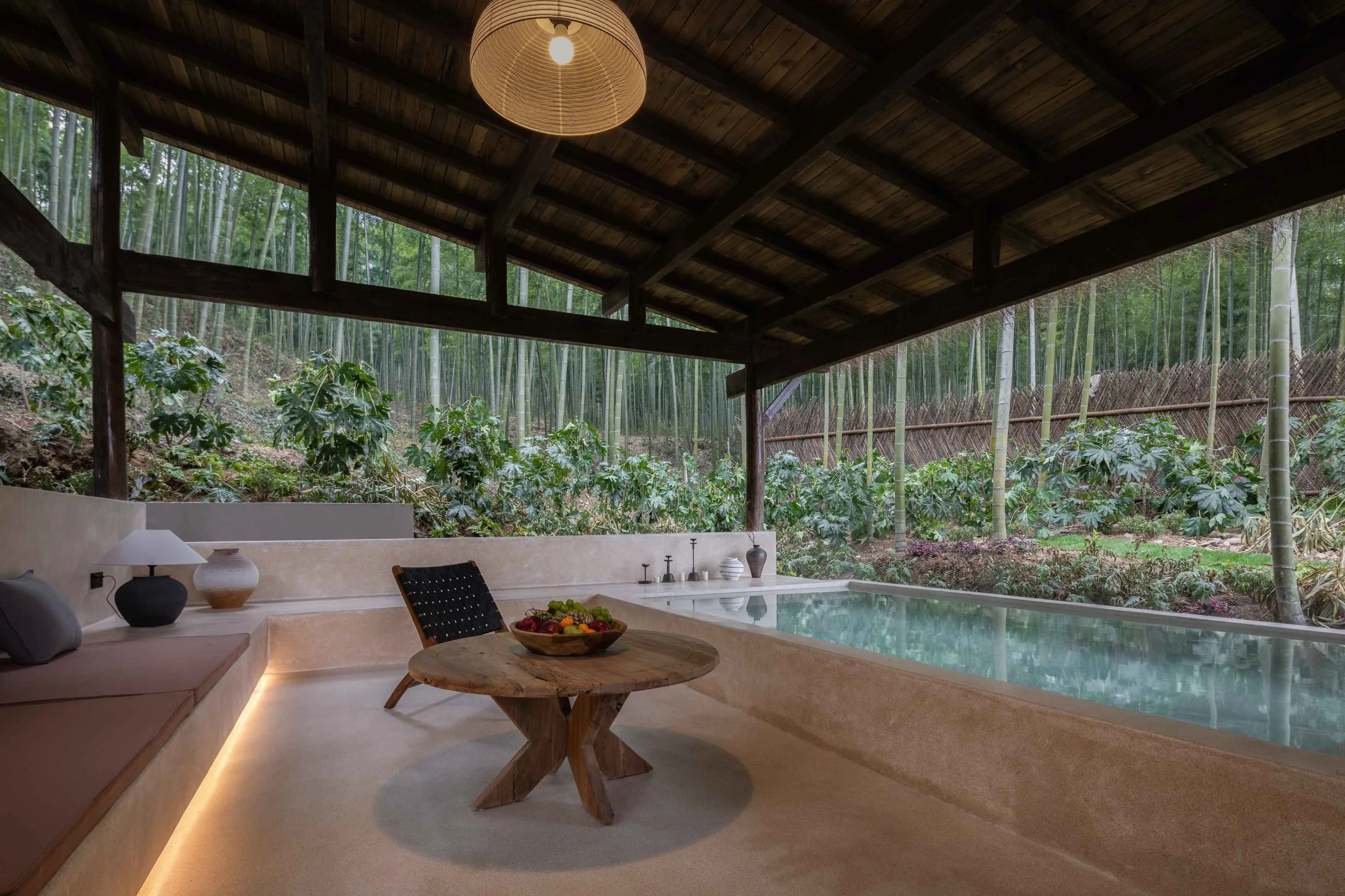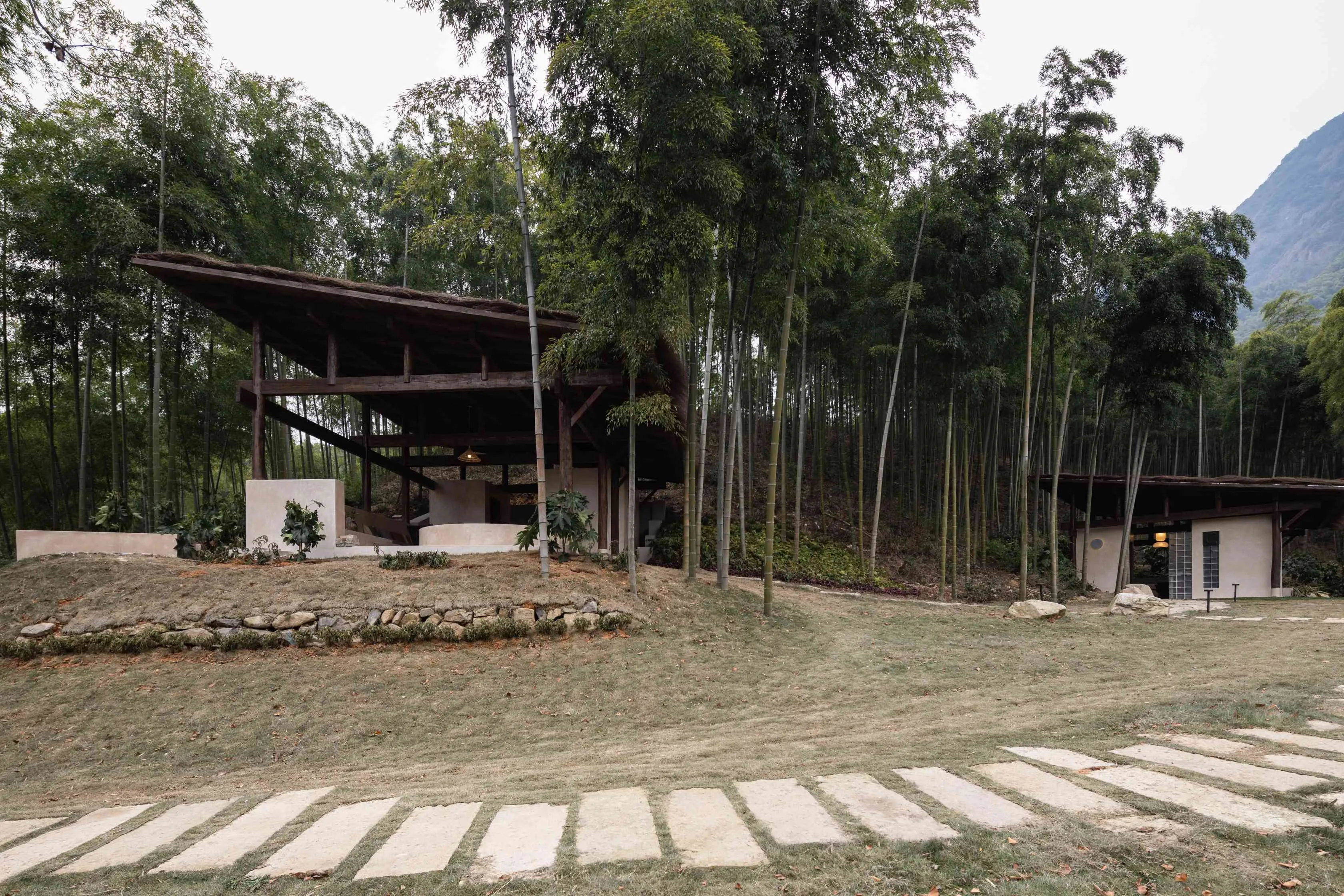 泡池隐匿于野在山川民宿的后半段私密竹林深处,仅需步行数分钟,自民宿接待中心悠然抵达。两个泡池坐落于竹林的缓坡之上,顺应地形呈左右两点散落分布。为保留场地的自然原始风貌,建筑巧妙择址于平整空地,主体结构采用传统木构,以当地回收的老木头精心打造,屋顶则呈现为简约的单坡顶,屋面更以就地取材的竹枝巧妙铺设。两个泡池被竹林包裹,同时周边的野生植物全部保留,客人踏入这片翠绿的竹林,瞬间仿佛穿越至世外桃源,远离尘嚣,沉浸于乡野竹境的宁静与雅致之中。