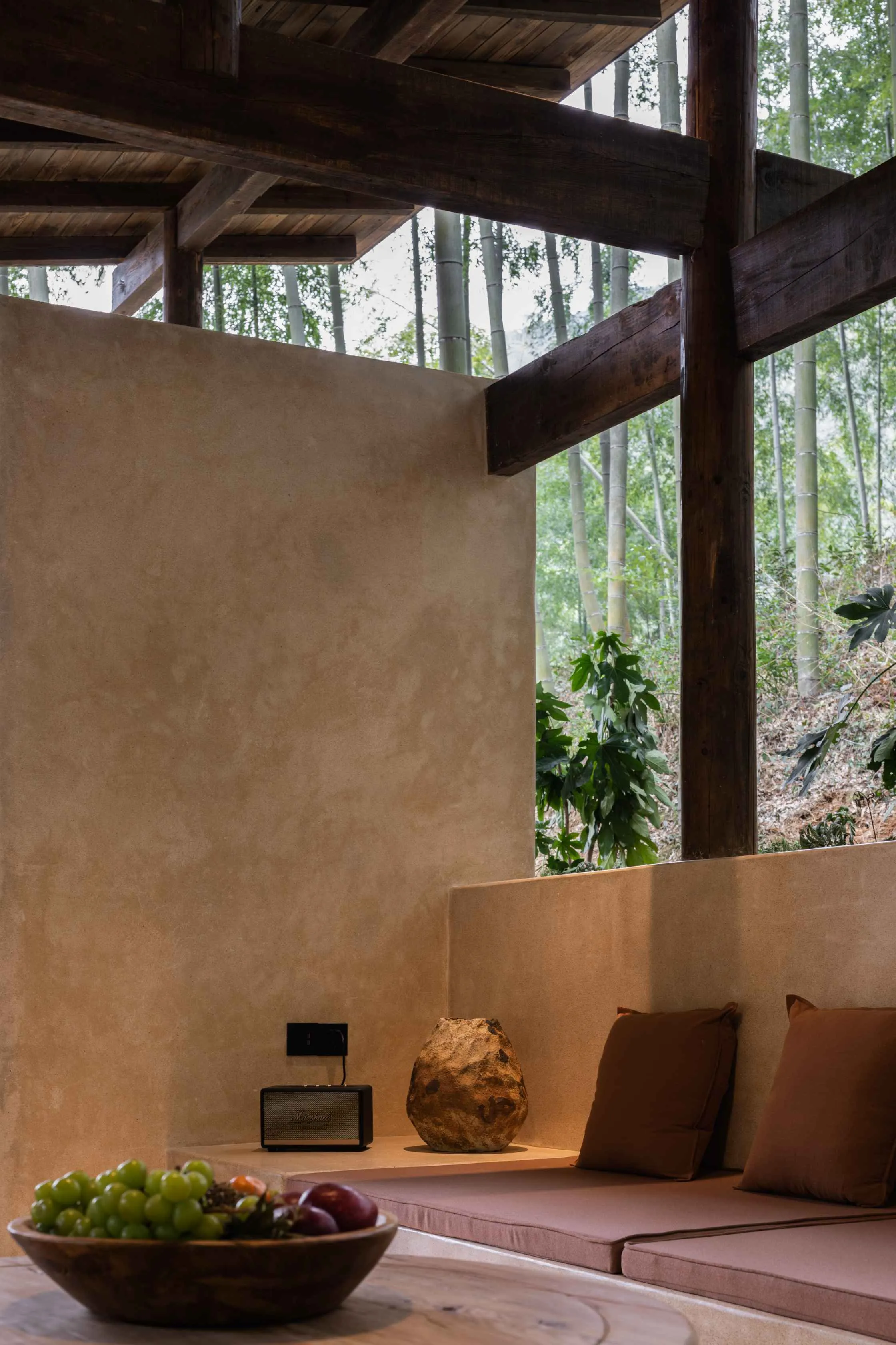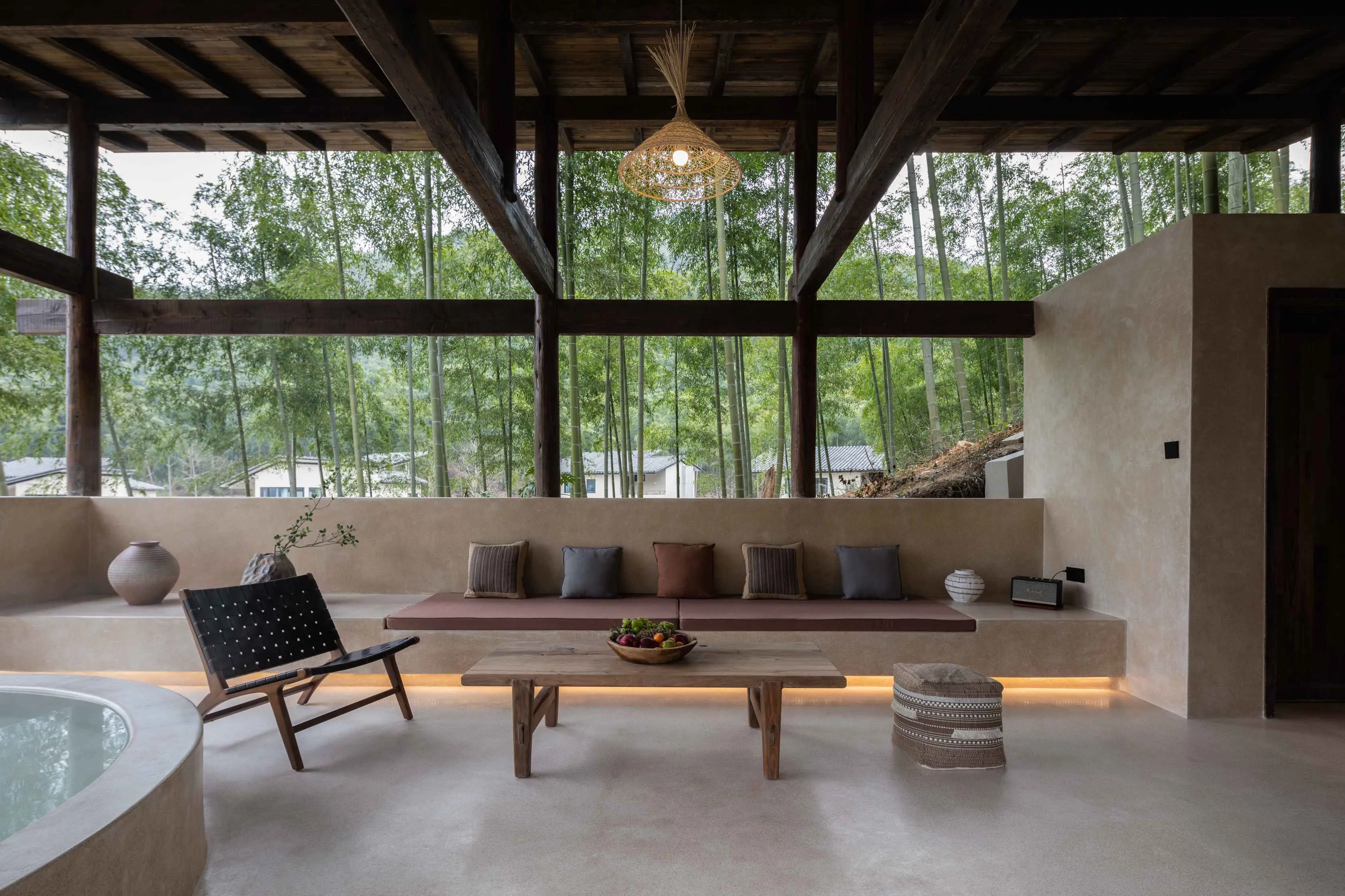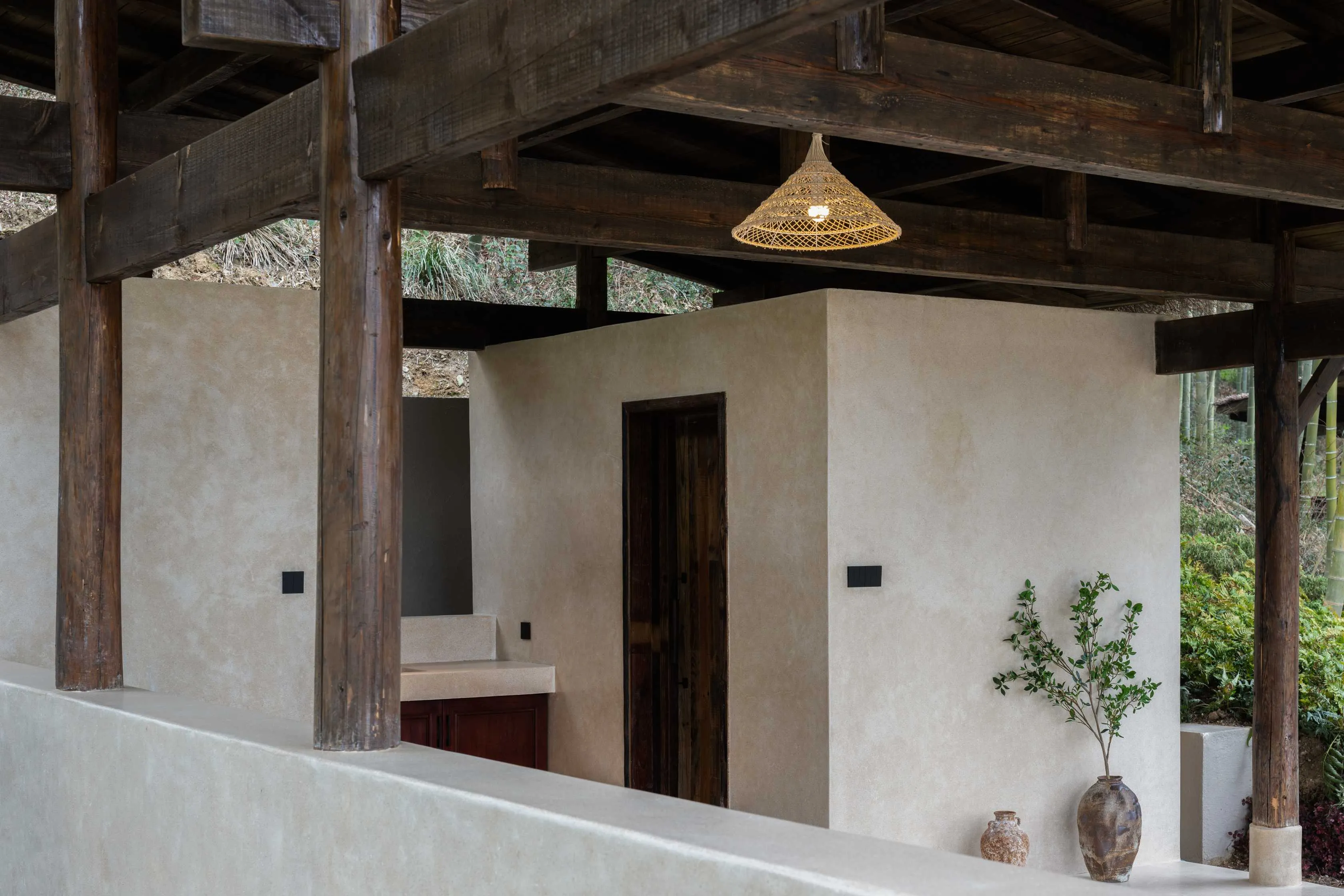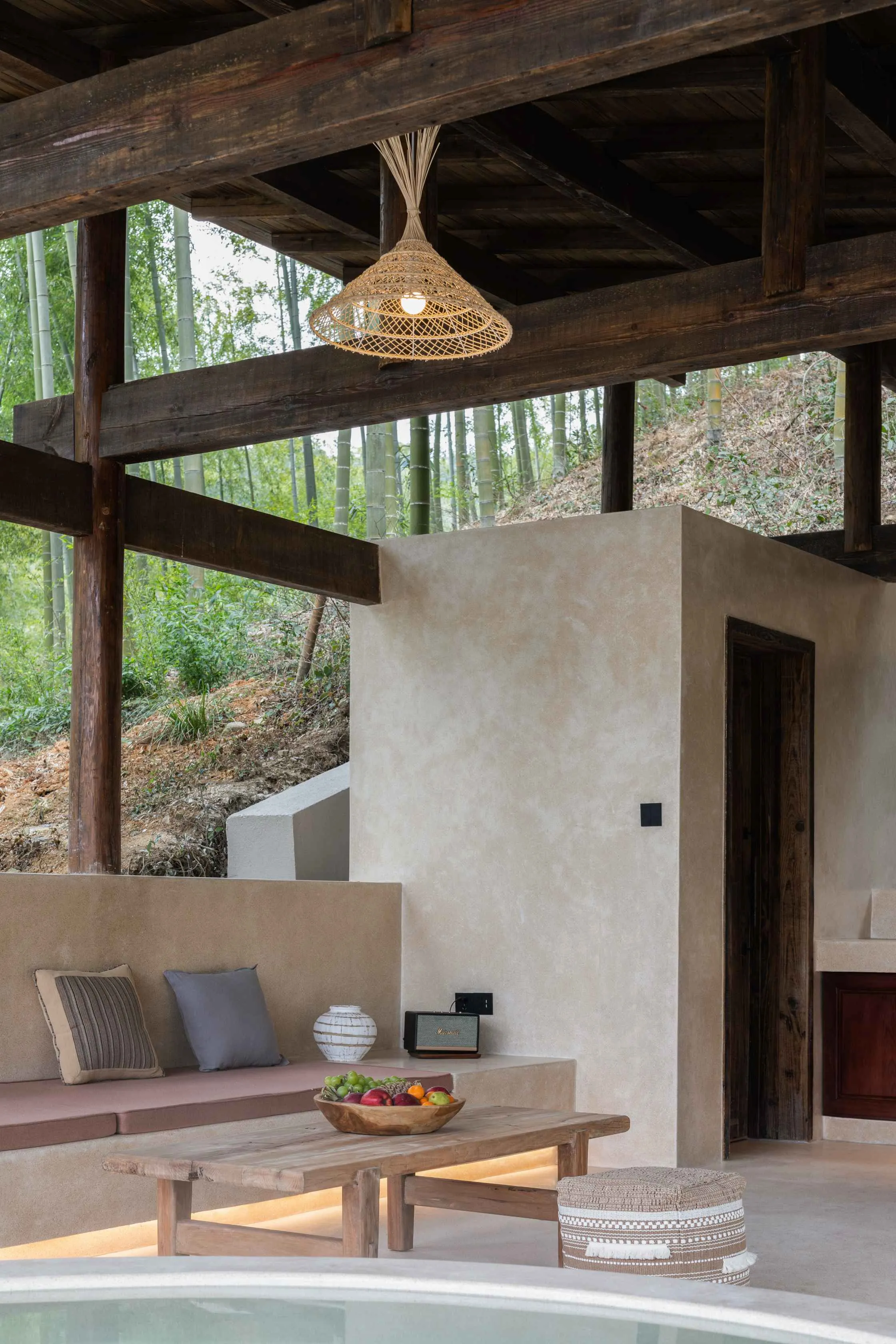 泡池隐匿于野在山川民宿的后半段私密竹林深处,仅需步行数分钟,自民宿接待中心悠然抵达。两个泡池坐落于竹林的缓坡之上,顺应地形呈左右两点散落分布。为保留场地的自然原始风貌,建筑巧妙择址于平整空地,主体结构采用传统木构,以当地回收的老木头精心打造,屋顶则呈现为简约的单坡顶,屋面更以就地取材的竹枝巧妙铺设。两个泡池被竹林包裹,同时周边的野生植物全部保留,客人踏入这片翠绿的竹林,瞬间仿佛穿越至世外桃源,远离尘嚣,沉浸于乡野竹境的宁静与雅致之中。