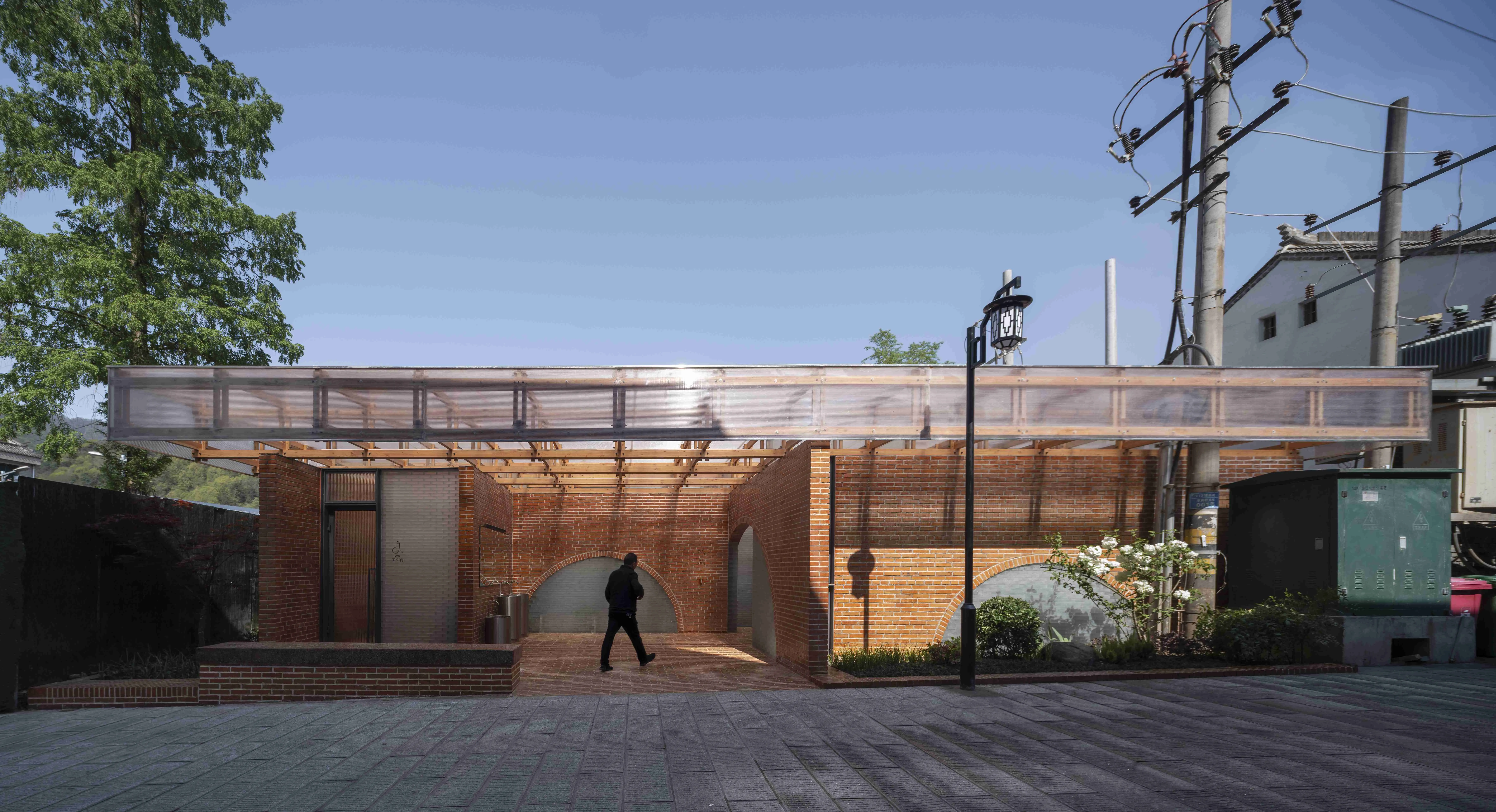 红砖、木条、玻璃砖,基于材料的碎片化形态,设计师用琐碎拼贴的设计方法,使建筑可被层层拆解。红砖材料的选择是源自场地记忆,旁边的民居都是红砖房,我们就很直觉的选择用红砖来做。公厕的墙体和地面都是红砖,墙体就是常见的丁顺砌筑,9顺1丁,地面全顺铺,缝隙宽度一致。砖块作为独立的构件,构建起了墙面和地面。用砖墙做成拱也是一种直觉,砖墙上没有多余的开洞,只有拱。拱洞的填充是玻璃砖,尺寸同红砖,用胶水粘结垒砌,遇到弧形边界进行尺寸切割。在没有屋顶的情况下整体空间关系已经成立,砖墙高度统一在3米,无形的边界空间也形成了。如果说不考虑使用功能,不做屋顶也不失为一种好选择。