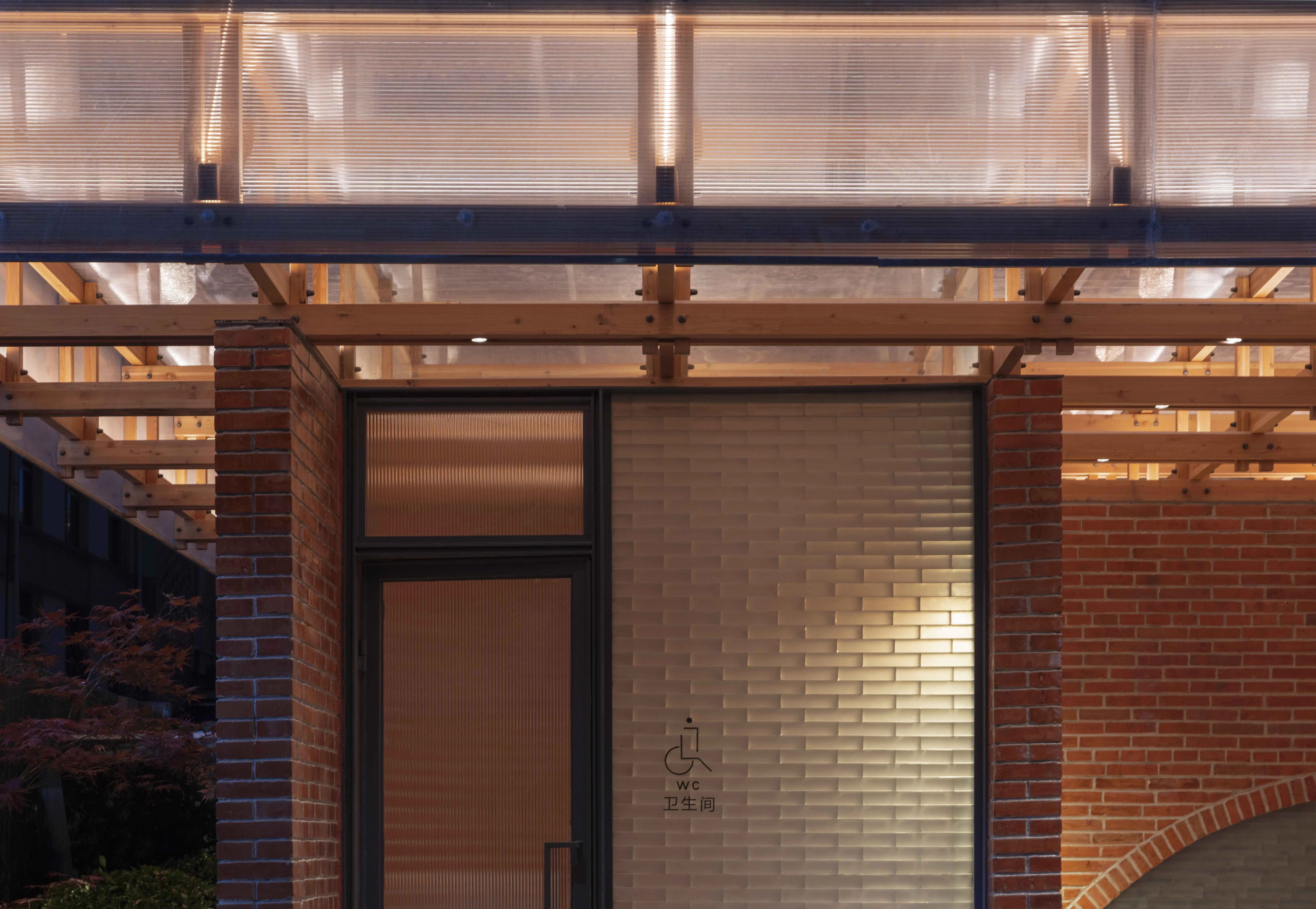 像公厕这样的小建筑,我坚持的设计原则是建造可视、材料清晰、错误暴露,造一个不被装饰隐藏的建筑。除了埋在地下的水电线路和砖墙内钢结构,其他都是赤裸的,每一块砖、每一根木头、每一个螺丝、每一个缝隙,都清晰可见。建筑的材料关系不是用室内室外来区分,而是用一种整体的设计语言逻辑去把控,就算房子放大一百倍也同样适用,我认为这样的房子有一种“可读性”。坚持赤裸的建造方式对施工队的要求很高,没有太多机会返工,几乎都只有一次机会,错了要么重来,要么就错了,错误也都看得见,像红砖就是重来了一遍,有缺陷;玻璃砖就是不同位置做法不同,有错误;屋顶的阳光板尺寸没有对齐木结构,有遗憾,但这些都不影响建筑的整体呈现效果,能够容忍一定的缺陷和遗憾也许是建筑师成长过程中的必修课。