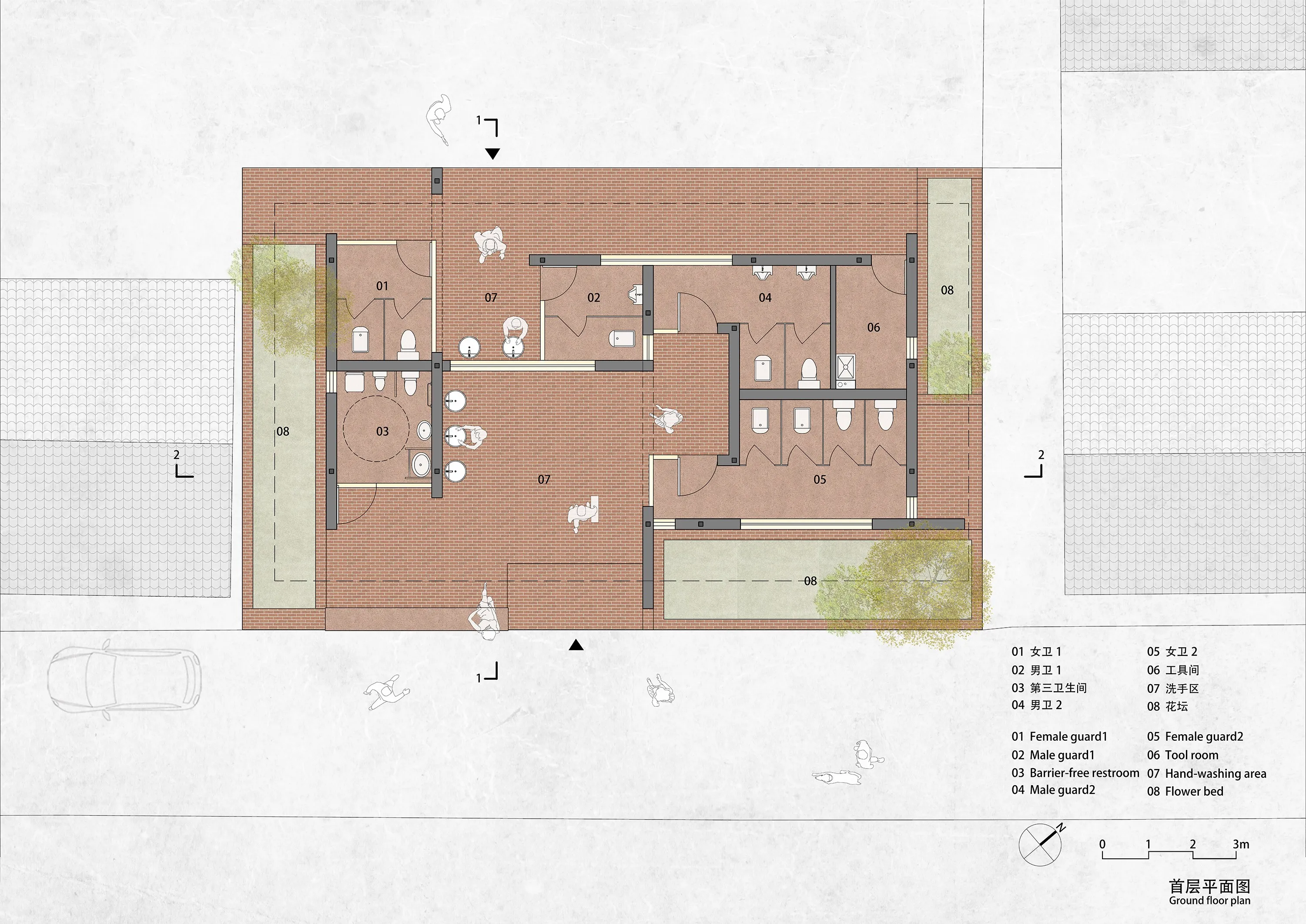 由于业主希望公厕能满足公交站内乘客、外来游客、居民等多种人群的使用需求,所以我们将这个卫生间设计成双卫生间,达到内侧公交站乘客和外侧街道居民和游客能共用的状态,对外设置了第三卫生间和母婴室,也能满足残障人士使用需求。入口区设置了一排坐凳,可以供居民闲坐休息。