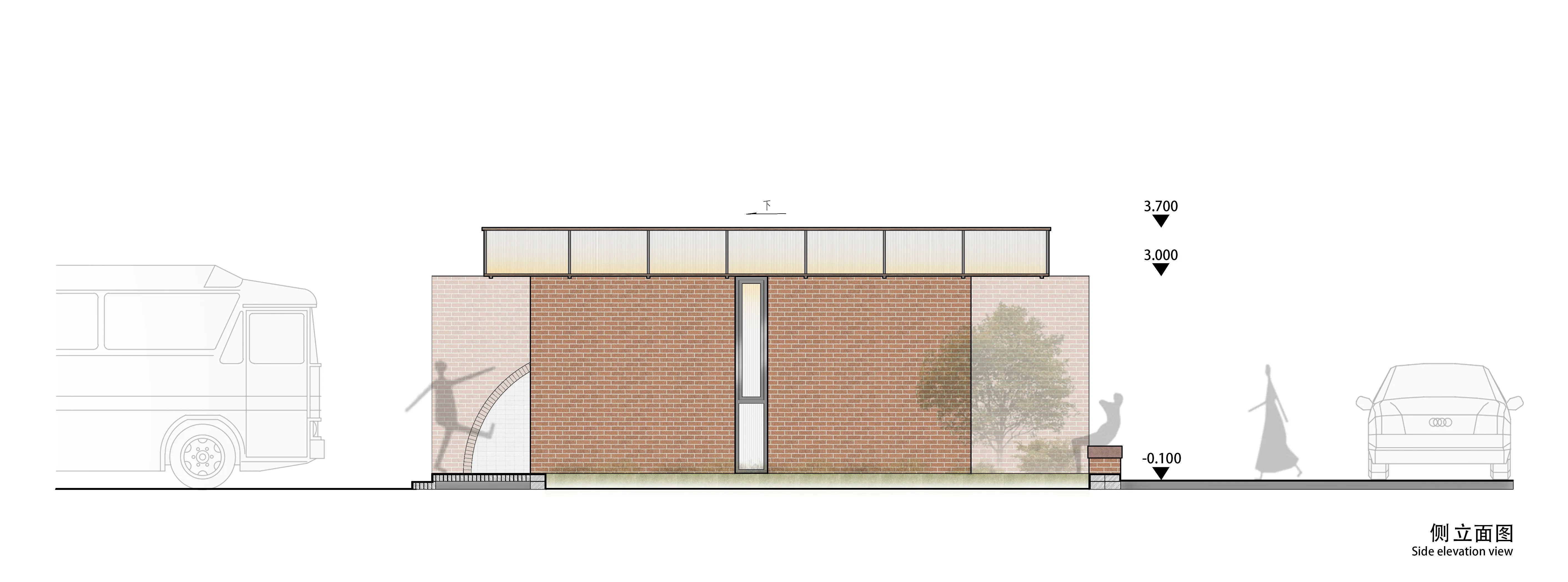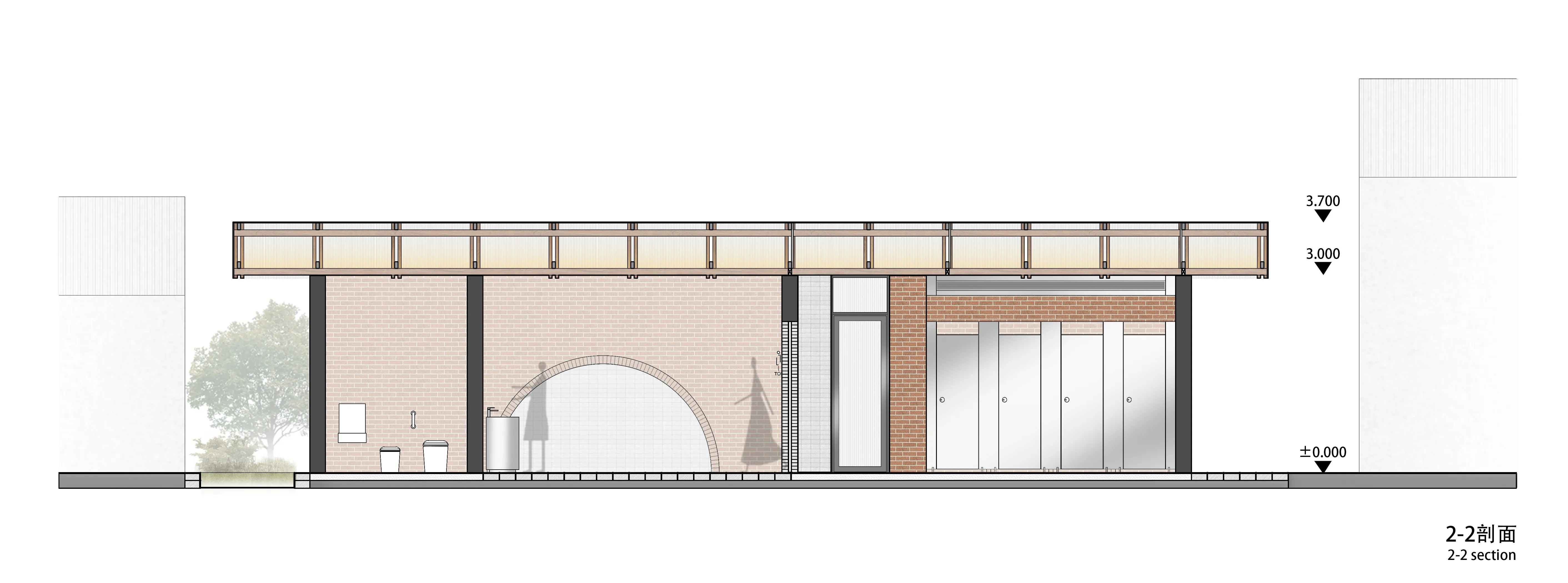 公厕所在的街道不是很宽,周边建筑都比较高,公厕被夹在中间。在这样的环境下我们依然希望公厕有比较强的公共性,将更多空间开放给街道。设计上将实体墙内退,留出较多的半室外开放空间,使空间有更多与人交互的可能性。